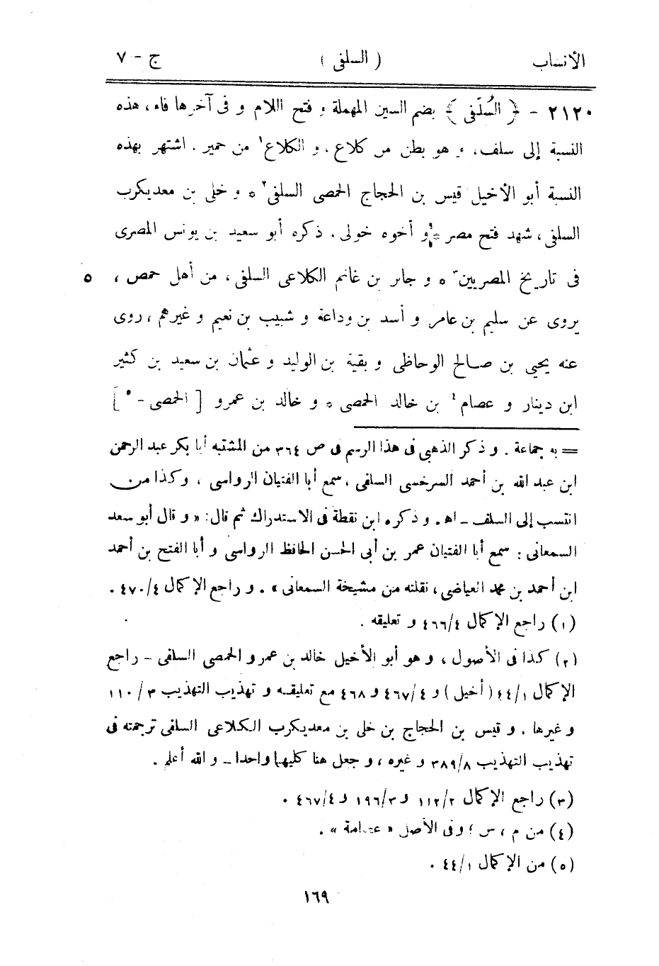 بضم السين المهملة وفتح اللام وفي آخرها فاء، هذه النسبة إلى سلف، وهو بطن من كلاع، والكلاع [1] من حمير، اشتهر بهذه النسبة أبو الأخيل قيس بن الحجاج الحمصي السلفي [2] وخلى بن معديكرب السلفي، شهد فتح مصر وأخوه خولى، ذكره أبو سعيد بن يونس المصري في تاريخ المصريين [3] وجابر بن غانم الكلاعي السلفي، من أهل حمص، يروى عن سليم بن عامر وأسد بن وداعة وشبيب بن نعيم وغيرهم، روى عنه يحيى بن صالح الوحاظى وبقية بن الوليد وعثمان بن سعيد بن كثير ابن دينار وعصام [4] بن خالد الحمصي وخالد بن عمرو [الحمصي-[5]]
