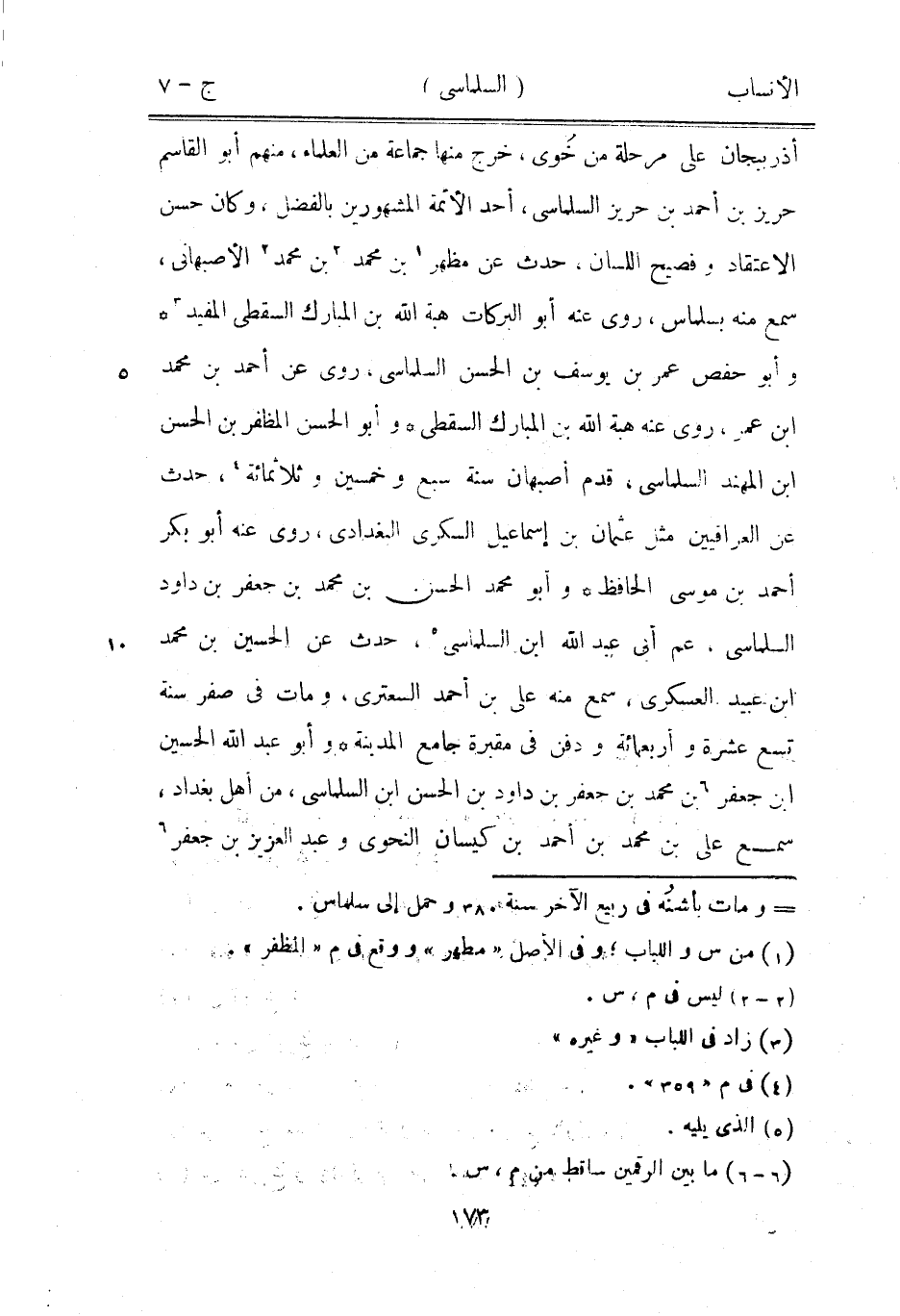 أذربيجان على مرحلة من خوى، خرج منها جماعة من العلماء، منهم أبو القاسم حريز بن أحمد بن حريز السلماسي، أحد الأئمة المشهورين بالفضل، وكان حسن الاعتقاد وفصيح اللسان، حدث عن مظهر [1] بن محمد [2] بن محمد [2] الأصبهاني، سمع منه بسلماس، روى عنه أبو البركات هبة الله بن المبارك السقطي المفيد [3] وأبو حفص عمر بن يوسف بن الحسن السلماسي، روى عن أحمد بن محمد ابن عمر، روى عنه هبة الله بن المبارك السقطي وأبو الحسن المظفر بن الحسن ابن المهند السلماسي، قدم أصبهان سنة سبع وخمسين وثلاثمائة [4] ، حدث عن العراقيين مثل عثمان بن إسماعيل السكرى البغدادي، روى عنه أبو بكر أحمد بن موسى الحافظ وأبو محمد الحسن بن محمد بن جعفر بن داود السلماسي، عم أبى عبد الله ابن السلماسي [5] ، حدث عن الحسين بن محمد ابن عبيد العسكري، سمع منه على بن أحمد السعترى، ومات في صفر سنة تسع عشرة وأربعمائة ودفن في مقبرة جامع المدينة وأبو عبد الله الحسين ابن جعفر [6] بن محمد بن جعفر بن داود بن الحسن ابن السلماسي، من أهل بغداد، سمع على بن محمد بن أحمد بن كيسان النحويّ وعبد العزيز بن جعفر [6]