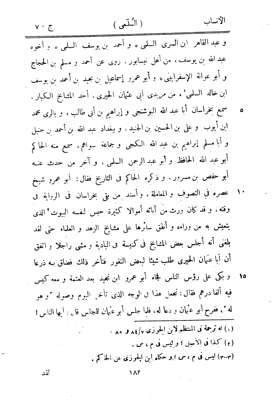 وعبد القاهر ابن السري السلمي وأحمد بن يوسف السلمي وأخوه عبد الله بن يوسف، من أهل نيسابور، روى عن أحمد ومسلم بن الحجاج وأبو عوانة الأسفرايينى وأبو عمرو إسماعيل بن بجيد بن أحمد بن يوسف ابن خالد السلمي [1] ، من مريدي أبى عثمان الحيريّ، أحد المشايخ الكبار، سمع بخراسان أبا عبد الله البوشنجي وإبراهيم بن أبى طالب، وبالري محمد ابن أيوب وعلى بن الحسين بن الجنيد، وببغداد عبد الله بن أحمد بن حنبل وأبا مسلم إبراهيم بن عبد الله الكجي وجماعة سواهم، سمع منه الحاكم أبو عبد الله الحافظ وأبو عبد الرحمن السلمي، وآخر من حدث عنه أبو حفص بن مسرور، وذكره الحاكم في التاريخ فقال: أبو عمرو شيخ عصره في التصوف والمعاملة، وأسند من بقي بخراسان في الرواية في وقته، وقد كان ورث من آبائه أموالا كثيرة حبس لنفسه البيوت [2] الّذي يتعيش به من وراءه وأنفق سائرها على مشايخ الزهد والعلماء حتى لقد بلغني أنه أجلس بعض المشايخ في كنيسة في البادية ومشى راجلا واتفق أن أبا عثمان الحيريّ طلب شيئا لبعض الثغور فتأخر ذلك فضاق به ذرعا وبكى على رءوس الناس فجاء أبو عمرو ابن نجيد بعد العتمة ومعه كيس فيه ألفا درهم فقال: تجعل هذا في الوجه الّذي تأخر اليوم وصوله [3] وهو له [3] ، ففرح أبو عثمان ودعا له، فلما جلس أبو عثمان للمجلس قال: أيها الناس!
