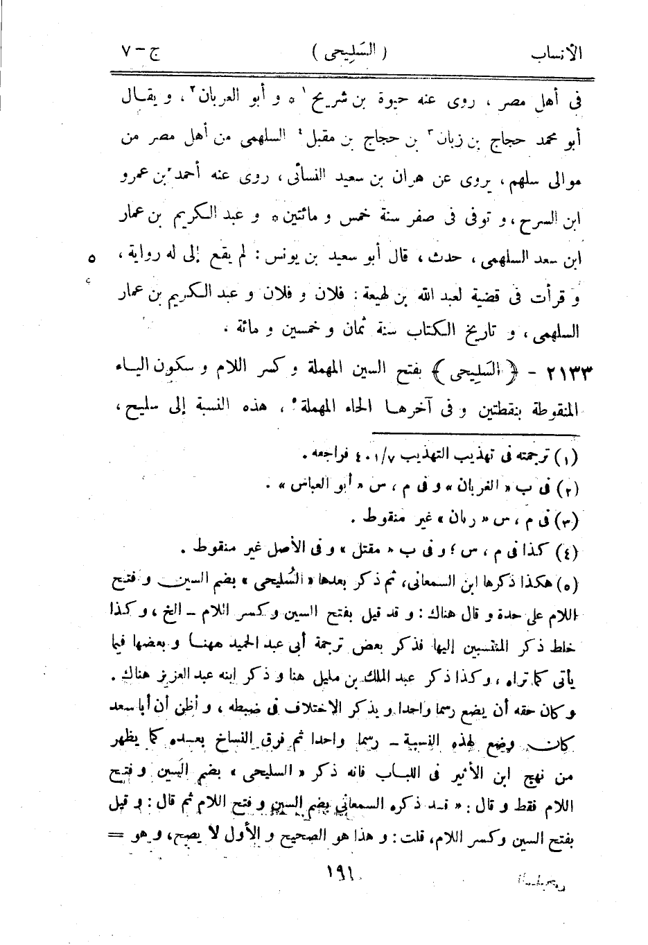 وكان حقه أن يضع رسما واحدا ويذكر الاختلاف في ضبطه، وأظن أن أبا سعد كان وضع لهذه النسبة- رسما واحدا ثم فرق النساخ بعده كما يظهر من نهج ابن الأثير في اللباب فإنه ذكر «السليحي» بضم السين وفتح اللام فقط وقال: «قد ذكره السمعاني بضم السين وفتح اللام ثم قال: وقيل بفتح السين وكسر اللام، قلت: وهذا هو الصحيح والأول لا يصح، وهو
