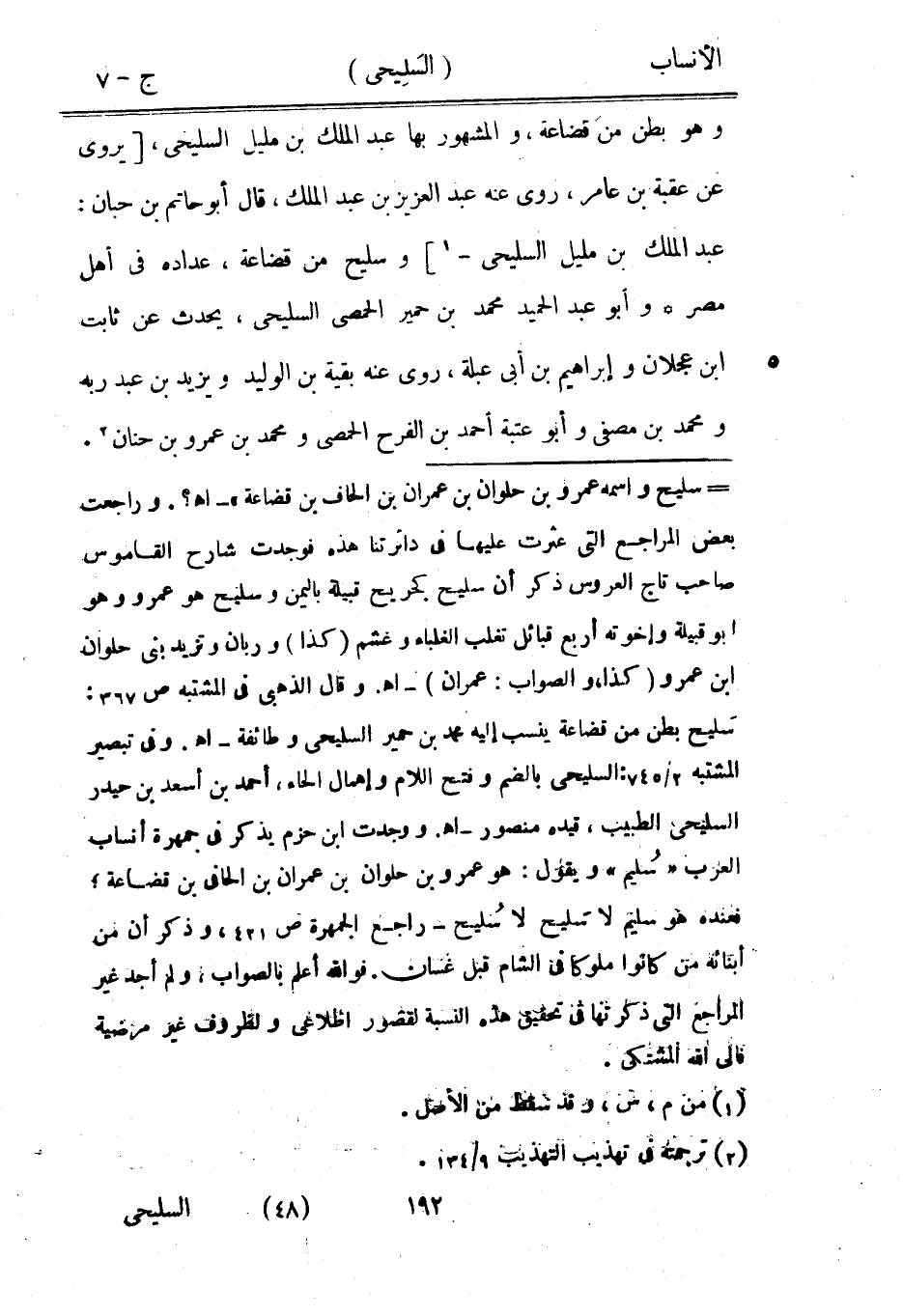 سليح بطن من قضاعة ينسب إليه محمد بن حمير السليحي وطائفة- أهـ. وفي تبصير المشتبه 2/ 745: السليحي بالضم وفتح اللام وإهمال الحاء، أحمد بن أسعد بن حيدر السليحي الطبيب، قيده منصور- أهـ. ووجدت ابن حزم يذكر في جمهرة أنساب العرب «سُليم» ويقول: هو عمرو بن حلوان بن عمران بن الحافى بن قضاعة، فعنده هو سليم لا سليح لا سليح- راجع الجمهرة ص 421، وذكر أن من أبنائه من كانوا ملوكا في الشام قبل غسان. فو الله أعلم بالصواب، ولم أجد غير المراجع التي ذكرتها في تحقيق هذه النسبة لقصور اطلاعى ولظروف غير مرضية فإلى الله المشتكى.