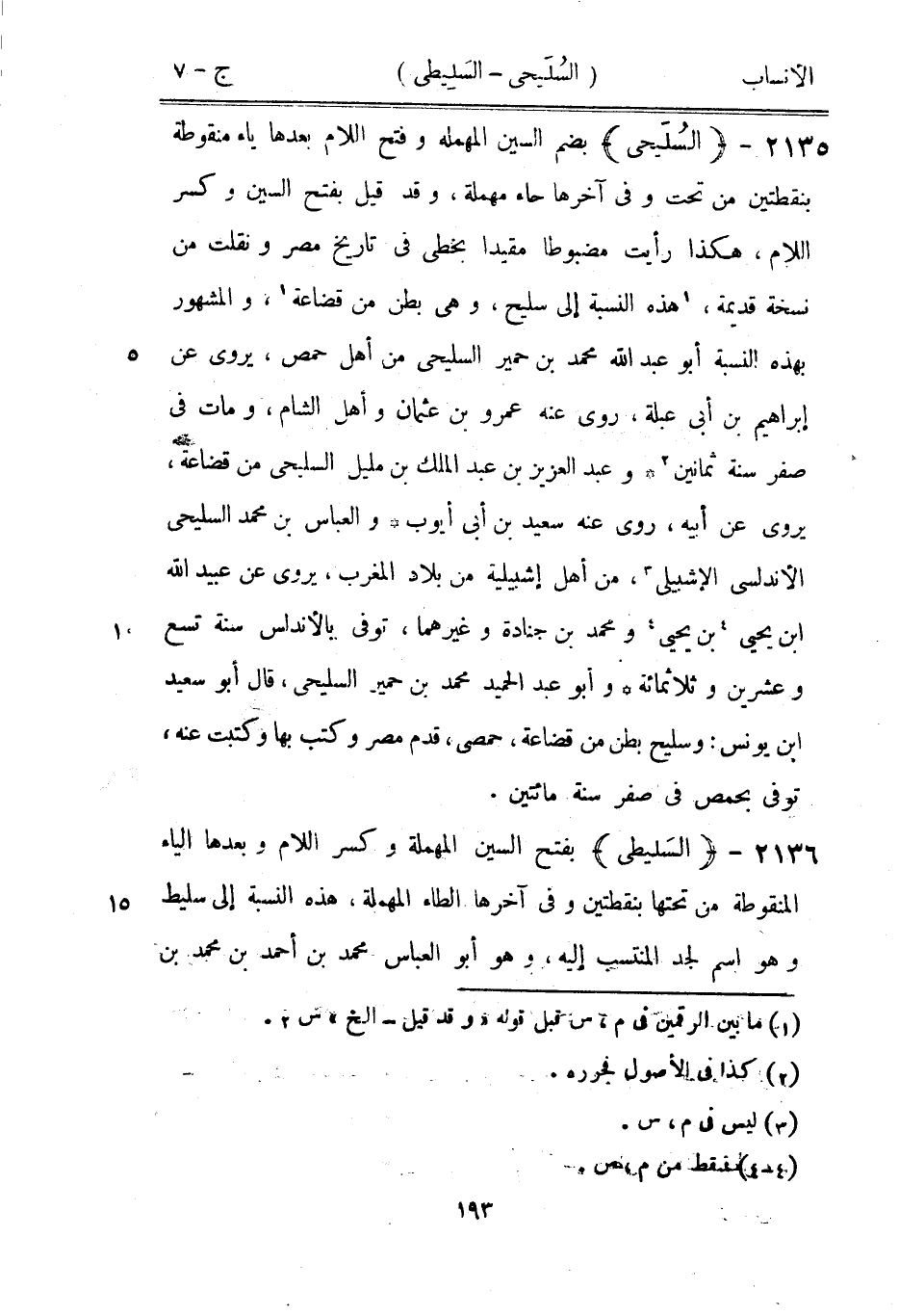 بضم السين المهملة وفتح اللام بعدها ياء منقوطة بنقطتين من تحت وفي آخرها حاء مهملة، وقد قيل بفتح السين وكسر اللام، هكذا رأيت مضبوطا مقيدا بخطي في تاريخ مصر ونقلت من نسخة قديمة، [1] هذه النسبة إلى سليح، وهي بطن من قضاعة [1] ، والمشهور بهذه النسبة أبو عبد الله محمد بن حمير السليحي من أهل حمص، يروى عن إبراهيم بن أبى عبلة، روى عنه عمرو بن عثمان وأهل الشام، ومات في صفر سنة ثمانين [2] وعبد العزيز بن عبد الملك بن مليل السليحي من قضاعة، يروى عن أبيه، روى عنه سعيد بن أبى أيوب والعباس بن محمد السليحي الأندلسى الإشبيلي [3] ، من أهل إشبيلية من بلاد المغرب، يروى عن عبيد الله ابن يحيى [4] بن يحيى [4] ومحمد بن جنادة وغيرهما، توفى بالأندلس سنة تسع وعشرين وثلاثمائة وأبو عبد الحميد محمد بن حمير السليحي، قال أبو سعيد ابن يونس: وسليح بطن من قضاعة، حمصى، قدم مصر وكتب بها وكتبت عنه، توفى بحمص في صفر سنة مائتين.