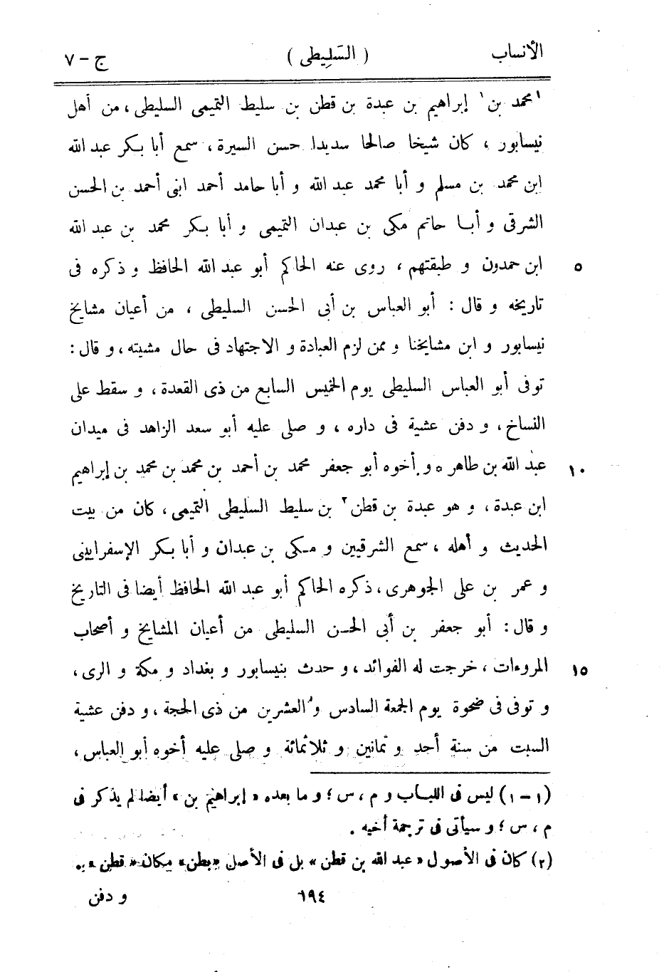 [1] محمد بن [1] إبراهيم بن عبدة بن قطن بن سليط التميمي السليطي، من أهل نيسابور، كان شيخا صالحا سديدا حسن السيرة، سمع أبا بكر عبد الله ابن محمد بن مسلم وأبا محمد عبد الله وأبا حامد أحمد ابني أحمد بن الحسن الشرقي وأبا حاتم مكي بن عبدان التميمي وأبا بكر محمد بن عبد الله ابن حمدون وطبقتهم، روى عنه الحاكم أبو عبد الله الحافظ وذكره في تاريخه وقال: أبو العباس بن أبى الحسن السليطي، من أعيان مشايخ نيسابور وابن مشايخنا وممن لزم العبادة والاجتهاد في حال مشيته، وقال: