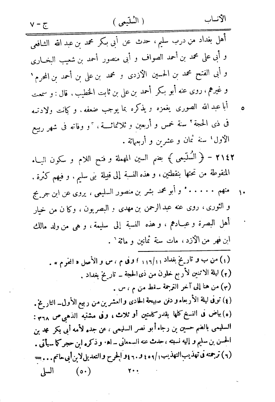 بضم السين المهملة وفتح اللام وسكون الياء المنقوطة من تحتها بنقطتين، وهذه النسبة إلى قبيلة بنى سليم، وفيهم كثرة، منهم.... [5] وأبو محمد بشر بن منصور السليمي، يروى عن ابن جريج والثوري، روى عنه عبد الرحمن بن مهدي والبصريون، وكان من خيار أهل البصرة وعبادهم، وهذه النسبة إلى سليمة، وهي من ولد مالك ابن فهر من الأزد، مات سنة ثمانين ومائة [6] .
