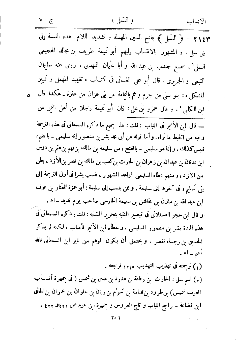 [ () ] قال ابن الأثير في اللباب: قلت: هذا جميع ما ذكره السمعاني في هذه الترجمة وفيه من الخبط ما تراه، وأما قوله عن أبى محمد بشر بن منصور إنه سليمى- بالضم، فليس كذلك، وإنما هو سليمى- بالفتح، من سليمة بن مالك بن فهم بن غنم بن دوس ابن عدنان بن عبد الله بن زهران بن الحارث بن كعب بن مالك بن نصر بن الأزد، بطن من الأزد، ومنهم عطاء السليمي الزاهد المشهور، فنسب بشرا في أول الترجمة إلى بنى سليم وفي آخرها إلى سليمة. وممن ينسب إلى سليمة: أبو حمزة المختار بن عوف ابن عبد الله بن مازن بن مخاشن بن سليمة الخارجي صاحب يوم قديد- أهـ.