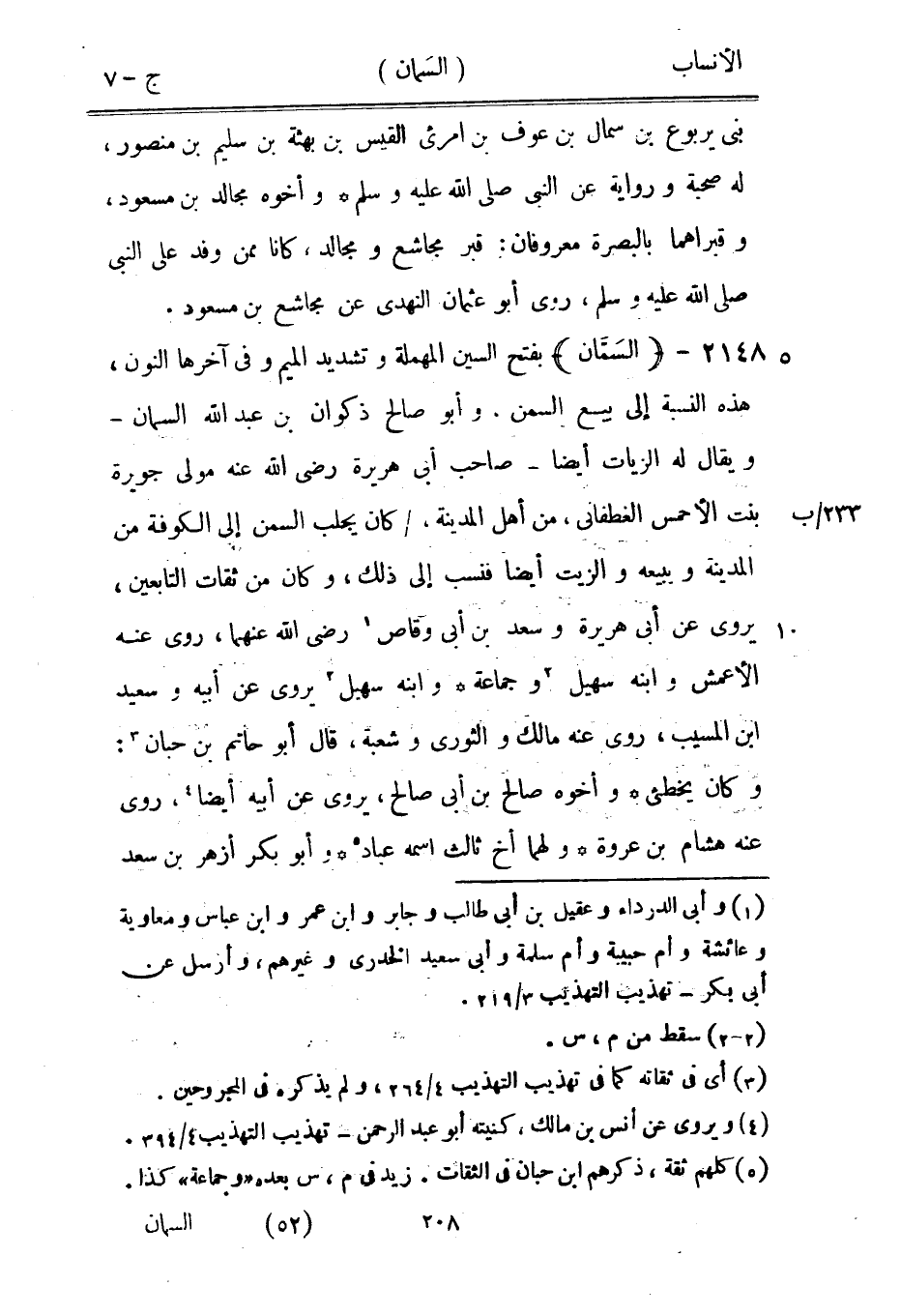 بفتح السين المهملة وتشديد الميم وفي آخرها النون، هذه النسبة إلى بيع السمن، وأبو صالح ذكوان بن عبد الله السمان- ويقال له الزيات أيضا- صاحب أبى هريرة رضى الله عنه مولى جويرة بنت الأحمس الغطفانيّ، من أهل المدينة،/ كان يجلب السمن إلى الكوفة من المدينة ويبيعه والزيت أيضا فنسب إلى ذلك، وكان من ثقات التابعين، يروى عن أبى هريرة وسعد بن أبى وقاص [1] رضى الله عنهما، روى عنه الأعمش وابنه سهيل [2] وجماعة وابنه سهيل [2] يروى عن أبيه وسعيد ابن المسيب، روى عنه مالك والثوري وشعبة، قال أبو حاتم بن حبان [3] :