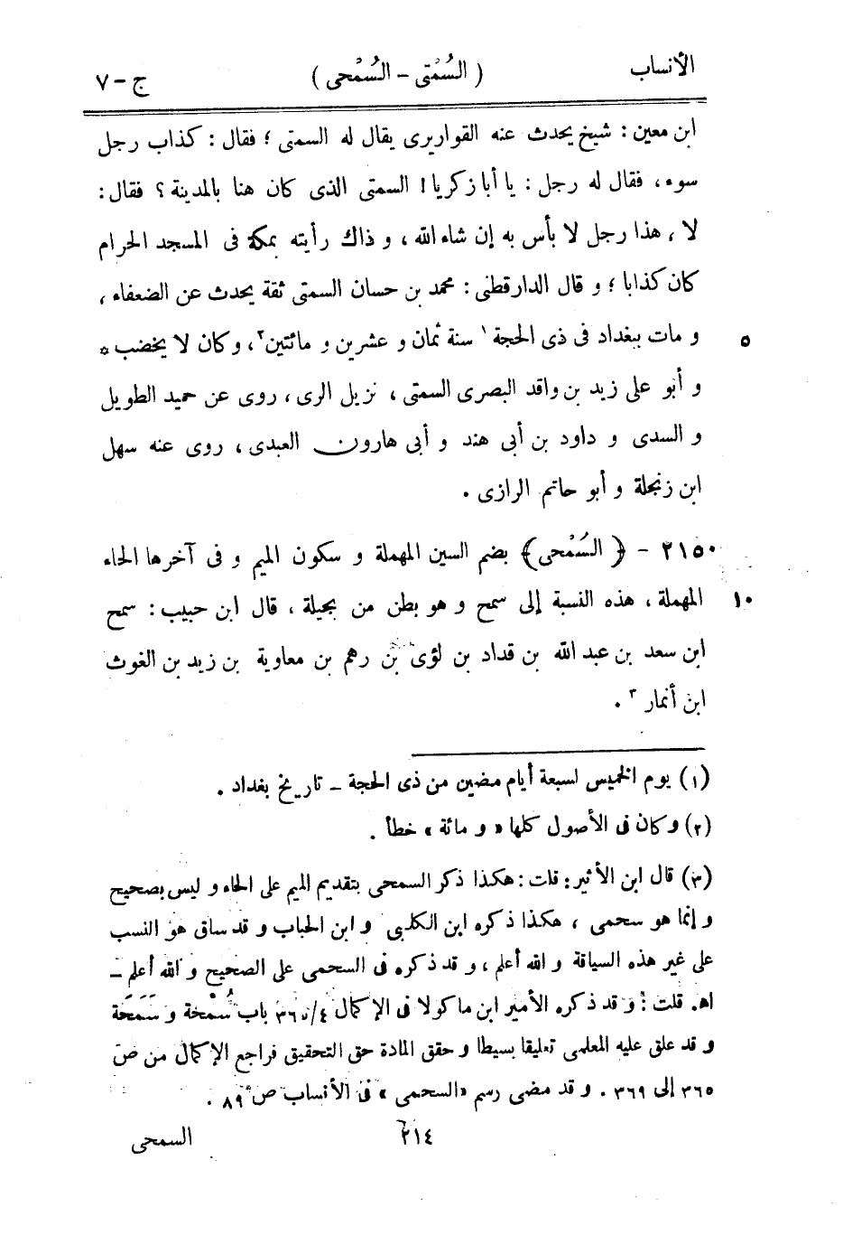 [3] قال ابن الأثير: قلت: هكذا ذكر السمحى بتقديم الميم على الحاء وليس بصحيح وإنما هو سحمى، هكذا ذكره ابن الكلبي وابن الحباب وقد ساق هو النسب على غير هذه السياقة والله أعلم، وقد ذكره في السحمى على الصحيح والله أعلم- أهـ. قلت: وقد ذكره الأمير ابن ماكولا في الإكمال 4/ 365 باب سمحة وسمحة وقد علق عليه المعلمي تعليقا بسيطا وحقق المادة حق التحقيق فراجع الإكمال من ص 365 إلى 369. وقد مضى رسم «السحمى» في الأنساب ص 89.