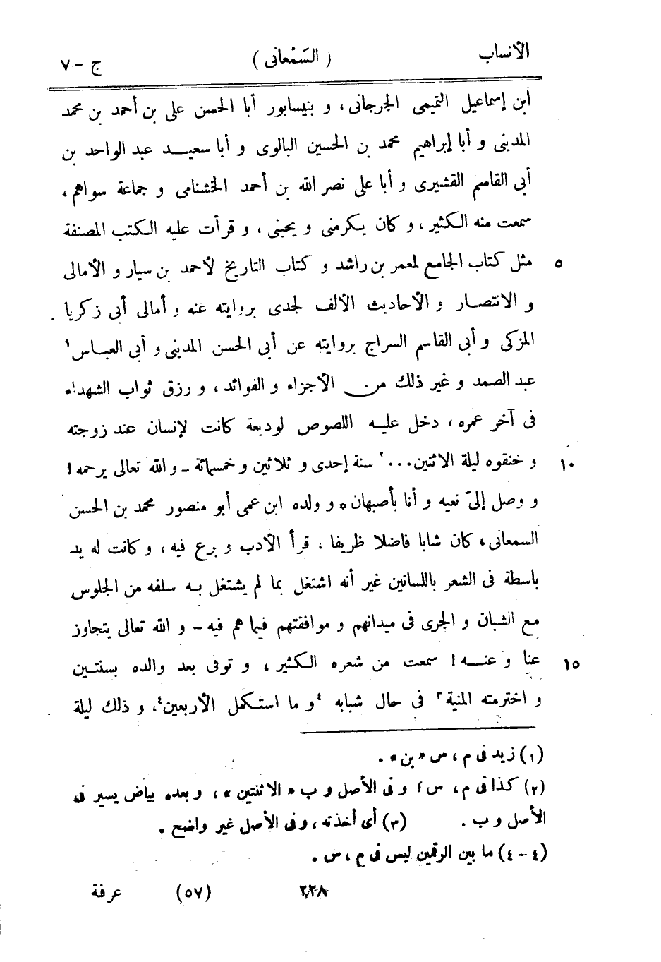 ابن إسماعيل التميمي الجرجاني، وبنيسابور أبا الحسن على بن أحمد بن محمد المديني وأبا إبراهيم محمد بن الحسين البالوي وأبا سعيد عبد الواحد بن أبى القاسم القشيري وأبا على نصر الله بن أحمد الخشنامى وجماعة سواهم، سمعت منه الكثير، وكان يكرمني ويحبني، وقرأت عليه الكتب المصنفة مثل كتاب الجامع لمعمر بن راشد وكتاب التاريخ لأحمد بن سيار والأمالي والانتصار والأحاديث الألف لجدي بروايته عنه وأمالى أبى زكريا المزكي وأبى القاسم السراج بروايته عن أبى الحسن المديني وأبى العباس [1] عبد الصمد وغير ذلك من الأجزاء والفوائد، ورزق ثواب الشهداء في آخر عمره، دخل عليه اللصوص لوديعة كانت لإنسان عند زوجته وخنقوه ليلة الاثنين ... [2] سنة إحدى وثلاثين وخمسمائة- والله تعالى يرحمه! ووصل إليّ نعيه وأنا بأصبهان وولده ابن عمى أبو منصور محمد بن الحسن السمعاني، كان شابا فاضلا ظريفا، قرأ الأدب وبرع فيه، وكانت له يد باسطة في الشعر باللسانين غير أنه اشتغل بما لم يشتغل به سلفه من الجلوس مع الشبان والجرى في ميدانهم وموافقتهم فيما هم فيه- والله تعالى يتجاوز عنا وعنه! سمعت من شعره الكثير، وتوفى بعد والده بسنتين واخترمته المنية [3] في حال شبابه [4] وما استكمل الأربعين [4] ، وذلك ليلة