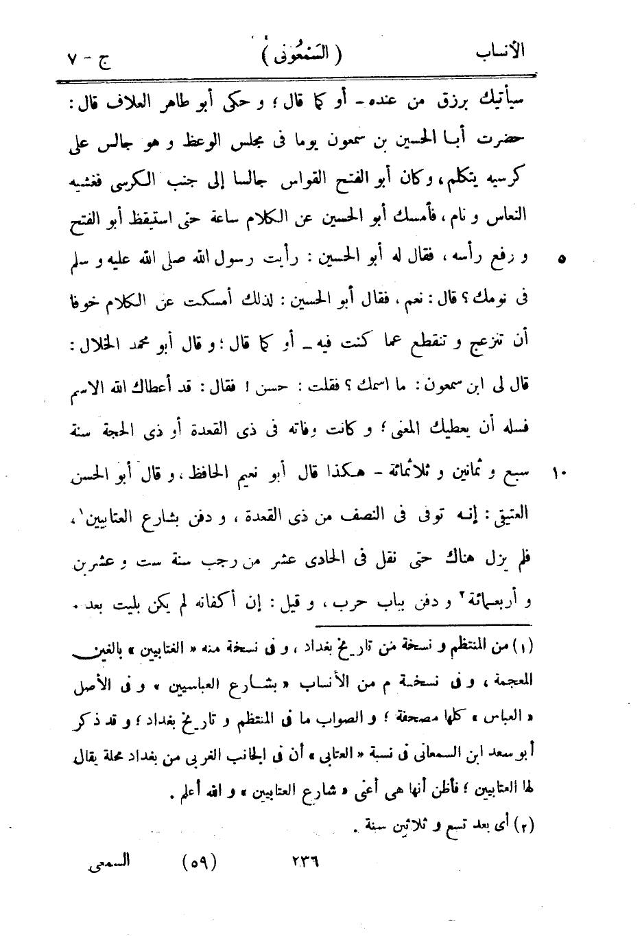 [1] من المنتظم ونسخة من تاريخ بغداد، وفي نسخة منه «الغتابيين» بالغين المعجمة، وفي نسخة م من الأنساب «بشارع العباسيين» وفي الأصل «العباس» كلها مصحفة، والصواب ما في المنتظم وتاريخ بغداد، وقد ذكر أبو سعد ابن السمعاني في نسبة «العتابى» أن في الجانب الغربي من بغداد محلة يقال لها العتابيين، فأظن أنها هي أعنى «شارع العتابيين» والله أعلم.