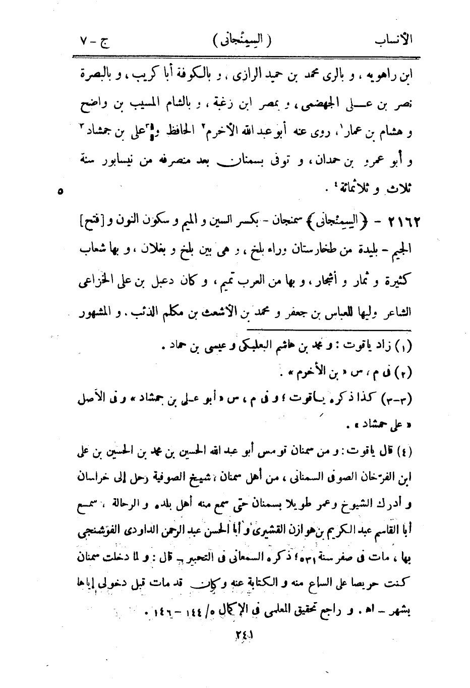 [4] قال ياقوت: ومن سمنان قومس أبو عبد الله الحسين بن محمد بن الحسين بن على ابن الفرّخان الصوفي السمناني، من أهل سمنان، شيخ الصوفية رحل إلى خراسان وأدرك الشيوخ وعمر طويلا بسمنان حتى سمع منه أهل بلده والرحالة، سمع أبا القاسم عبد الكريم بن هوازن القشيري وأبا الحسن عبد الرحمن الداوديّ الفوشنجى بها، مات في صفر سنة 531، ذكره السمعاني في التحبير- قال: ولما دخلت سمنان كنت حريصا على السماع منه والكتابة عنه وكان قد مات قبل دخولي إياها بشهر- أهـ. وراجع تحقيق المعلمي في الإكمال 5/ 144- 146.