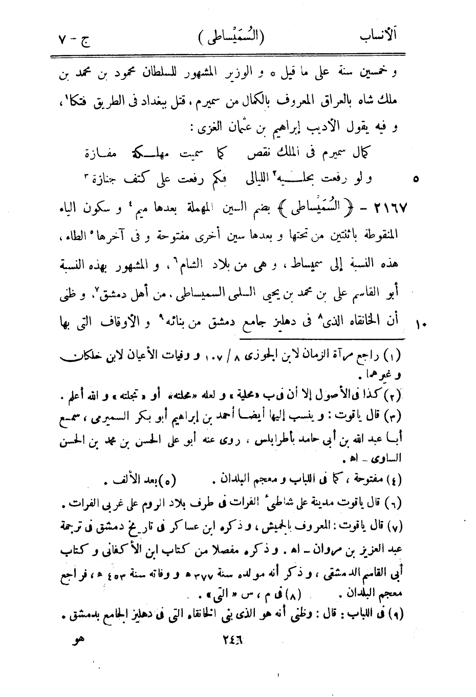 بضم السين المهملة بعدها ميم [4] وسكون الياء المنقوطة باثنتين من تحتها وبعدها سين أخرى مفتوحة وفي آخرها [5] الطاء، هذه النسبة إلى سميساط، وهي من بلاد الشام [6] ، والمشهور بهذه النسبة أبو القاسم على بن محمد بن يحيى السلمي السميساطى، من أهل دمشق [7] ، وظني أن الخانقاه الّذي [8] في دهليز جامع دمشق من بنائه [9] والأوقاف التي بها