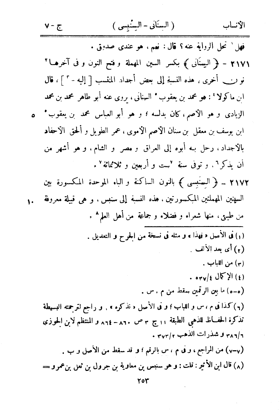 بكسر السين المهملة وفتح النون وفي آخرها [2] نون أخرى، هذه النسبة إلى بعض أجداد المنتسب [إليه-[3]] ، قال ابن ماكولا [4] : هو محمد بن يعقوب [5] السناني، يروى عنه أبو طاهر محمد بن محمد الزيادي وهو الأصم، كان يدلسه، وهو أبو العباس محمد بن يعقوب [5] ابن يوسف بن معقل بن سنان الأصم الأموي، عمر الطويل وألحق الأحفاد بالأجداد، رحل به أبوه إلى العراق ومصر والشام، وهو أشهر من أن يذكر [6] ، وتوفى سنة [7] ست وأربعين وثلاثمائة [7] .