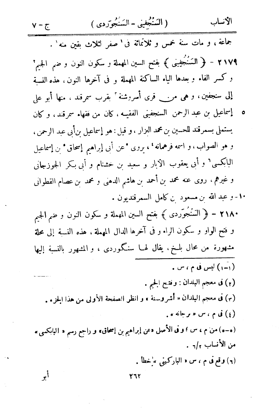 بفتح السين المهملة وسكون النون وضم الجيم [2] وكسر الفاء وبعدها الياء الساكنة المهملة وفي آخرها النون، هذه النسبة إلى سنجفين، وهي من قرى أسروشنة [3] بقرب سمرقند، منها أبو على إسماعيل بن عبد الرحمن السنجفينى الفقيه، كان من فقهاء سمرقند، وكان يستملى بسمرقند للحسين بن محمد البزار، وقيل: هو إسماعيل بن أبى عبد الرحمن، وهو الصواب، واسمه فرهمانه [4] ، يروى [5] عن أبى إبراهيم إسحاق [5] بن إسماعيل البابكسى [6] وأبى يعقوب الأبار وسعيد بن خشنام وأبى بكر الجوزجاني وغيرهم، روى عنه محمد بن أحمد بن هاشم الدهني ومحمد بن عصام القطواني وعبد الله بن مسعود بن كامل السمرقنديون.