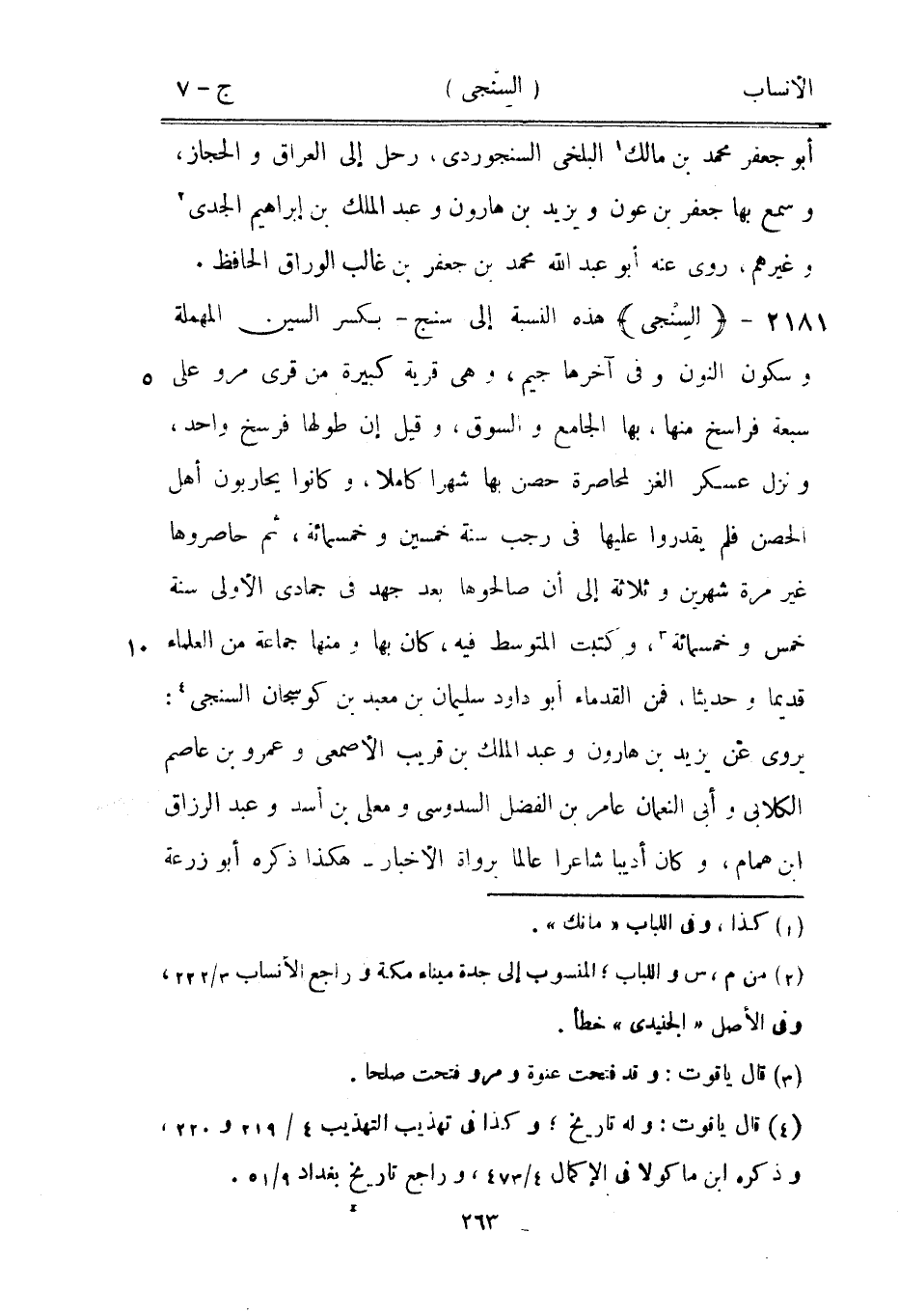 هذه النسبة إلى سنج- بكسر السين المهملة وسكون النون وفي آخرها جيم، وهي قرية كبيرة من قرى مرو على سبعة فراسخ منها، بها الجامع والسوق، وقيل إن طولها فرسخ واحد، ونزل عسكر الغز لمحاصرة حصن بها شهرا كاملا، وكانوا يحاربون أهل الحصن فلم يقدروا عليها في رجب سنة خمسين وخمسمائة، ثم حاصروها غير مرة شهرين وثلاثة إلى أن صالحوها بعد جهد في جمادى الأولى سنة خمس وخمسمائة [3] ، وكتبت المتوسط فيه، كان بها ومنها جماعة من العلماء قديما وحديثا، فمن القدماء أبو داود سليمان بن معبد بن كوسجان السنجى [4] :