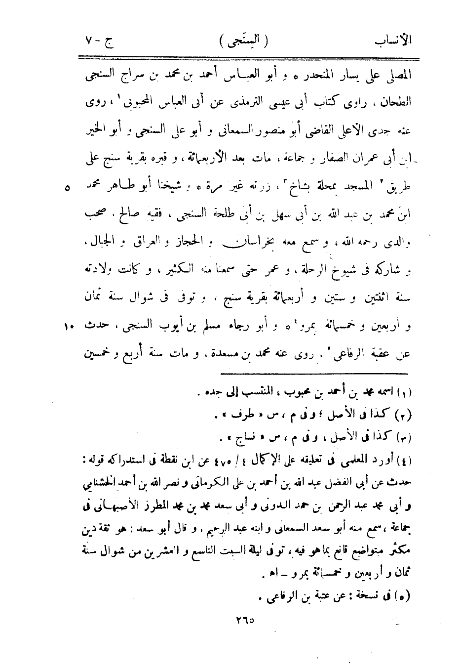 المصلى على يسار المنحدر وأبو العباس أحمد بن محمد بن سراج السنجى الطحان، راوي كتاب أبى عيسى الترمذي عن أبى العباس المحبوبي [1] ، روى عنه جدي الأعلى القاضي أبو منصور السمعاني وأبو على السنجى وأبو الخير ابن أبى عمران الصفار وجماعة، مات بعد الأربعمائة، وقبره بقرية سنج على طريق [2] المسجد بمحلة بشاخ [3] ، زرته غير مرة وشيخنا أبو طاهر محمد ابن محمد بن عبد الله بن أبى سهل بن أبى طلحة السنجى، فقيه صالح، صحب والدي رحمه الله، وسمع معه بخراسان والحجاز والعراق والجبال، وشاركه في شيوخ الرحلة، وعمر حتى سمعنا منه الكثير، وكانت ولادته سنة اثنتين وستين وأربعمائة بقرية سنج، وتوفى في شوال سنة ثمان وأربعين وخمسمائة بمرو [4] وأبو رجاء مسلم بن أيوب السنجى، حدث عن عقبة الرفاعيّ [5] ، روى عنه محمد بن مسعدة، ومات سنة أربع وخمسين