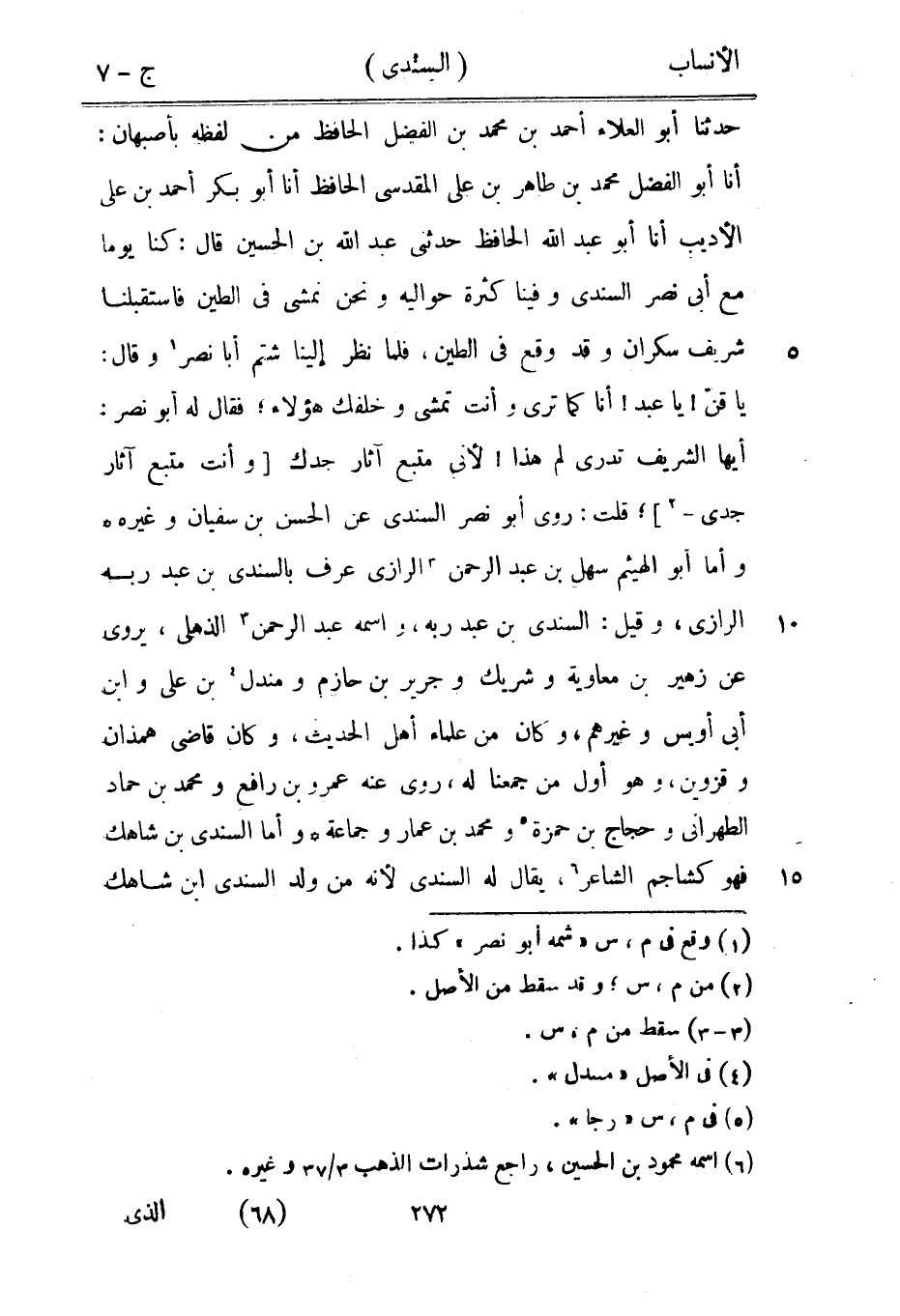 أيها الشريف تدري لم هذا! لأني متبع آثار جدك [وأنت متبع آثار جدي-[2]] ، قلت: روى أبو نصر السندي عن الحسن بن سفيان وغيره وأما أبو الهيثم سهل بن عبد الرحمن [3] الرازيّ عرف بالسندي بن عبد ربه الرازيّ، وقيل: السندي بن عبد ربه، واسمه عبد الرحمن [3] الذهلي، يروى عن زهير بن معاوية وشريك وجرير بن حازم ومندل [4] بن على وابن أبى أويس وغيرهم، وكان من علماء أهل الحديث، وكان قاضى همذان وقزوين، وهو أول من جمعنا له، روى عنه عمرو بن رافع ومحمد بن حماد الطهراني وحجاج بن حمزة [5] ومحمد بن عمار وجماعة وأما السندي بن شاهك فهو كشاجم الشاعر [6] ، يقال له السندي لأنه من ولد السندي ابن شاهك