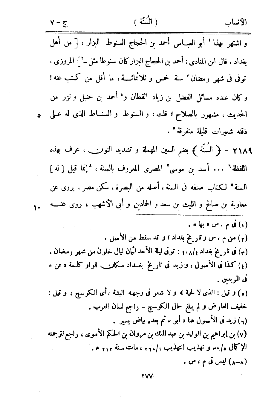 بضم السين المهملة وتشديد النون، عرف بهذه اللفظة [6] ... أسد بن موسى [7] المصري المعروف بالسنة، [8] إنما قيل [له] السنة [8] لكتاب صنفه في السنة، أصله من البصرة، سكن مصر، يروى عن معاوية بن صالح والليث بن سعد والحمادين وأبى الأشهب، روى عنه