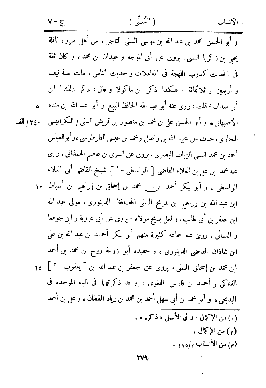 وأبو الحسن محمد بن عبد الله بن موسى السنى التاجر، من أهل مرو، نافلة يحيى بن زكريا السنى، يروى عن أبى الموجه وعبدان بن محمد، وكان ثقة في الحديث كذوب اللهجة في المعاملات وحديث الناس، مات سنة نيف وأربعين وثلاثمائة- هكذا ذكر ابن ماكولا وقال: ذكر ذلك [1] ابن أبى معدان، قلت: روى عنه أبو عبد الله الحافظ البيع وأبو عبد الله بن مندة الأصبهاني وأبو الحسن على بن محمد بن منصور بن قريش السنى/ الكرابيسي البخاري، حدث عن عبيد الله بن واصل ومحمد بن عيسى الطرطوسي وأبو العباس أحمد بن محمد السنى الزيات البصري، يروى عن السري بن عاصم الهمذانيّ، روى عنه محمد بن على بن العلاء القاضي [الواسطي-[2]] شيخ القاضي أبى العلاء الواسطي وأبو بكر أحمد بن محمد بن إسحاق بن إبراهيم بن أسباط ابن عبد الله بن إبراهيم بن بديح السنى الحافظ الدينَوَريّ، مولى عبد الله ابن جعفر بن أبى طالب، ولعل بديح مولاه- يروى عن أبى عروبة وابن جوصا والنسائي، روى عنه جماعة كثيرة منهم أبو بكر أحمد بن عبد الله بن على ابن شاذان القاضي الدينَوَريّ وحفيده أبو زرعة روح بن محمد بن أحمد ابن محمد بن إسحاق السنى، يروى عن جعفر بن عبد الله بن [يعقوب-[3]] الفناكى وأحمد بن فارس اللغوي، وقد ذكرتهما في الباء الموحدة في البديحى وأبو محمد بن أبى سهل أحمد بن محمد بن زياد القطان وعلى بن أحمد