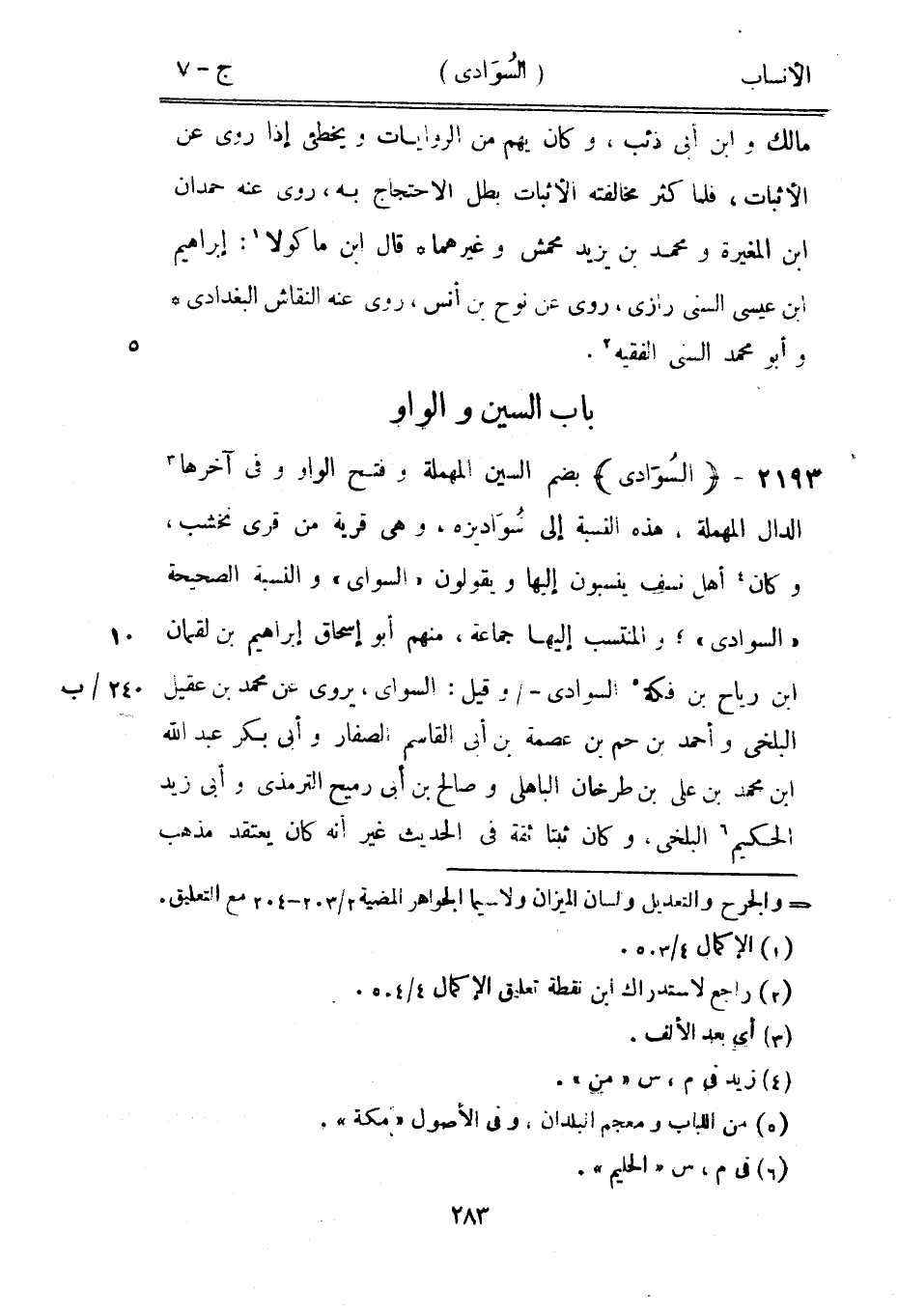 بضم السين المهملة وفتح الواو وفي آخرها [3] الدال المهملة، هذه النسبة إلى سواديزه، وهي قرية من قرى نخشب، وكان [4] أهل نسف ينسبون إليها ويقولون «السوأى» والنسبة الصحيحة «السوادى» ، والمنتسب إليها جماعة، منهم أبو إسحاق إبراهيم بن لقمان ابن رياح بن فكة [5] السوادى-/ وقيل: السوأى، يروى عن محمد بن عقيل البلخي وأحمد بن حم بن عصمة بن أبى القاسم الصفار وأبى بكر عبد الله ابن محمد بن على بن طرخان الباهلي وصالح بن أبى رميح الترمذي وأبى زيد الحكيم [6] البلخي، وكان ثبتا ثقة في الحديث غير أنه كان يعتقد مذهب