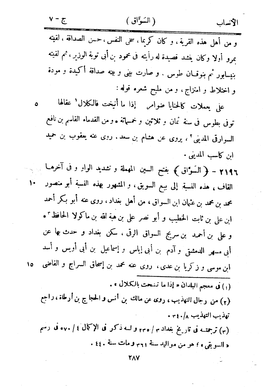 بفتح السين المهملة وتشديد الواو وفي آخرها القاف، هذه النسبة إلى بيع السويق، والمشهور بهذه النسبة أبو منصور محمد بن محمد بن عثمان ابن السواق، من أهل بغداد، روى عنه أبو بكر أحمد ابن على بن ثابت الخطيب وأبو نصر على بن هبة الله بن ماكولا الحافظ [3] وعلى بن أحمد بن سريج السواق الرقى، سكن بغداد وحدث بها عن أبى مسهر الدمشقيّ وآدم بن أبى إياس وإسماعيل بن أبى أويس وأسد ابن موسى وزكريا بن عدي، روى عنه محمد بن إسحاق السراج والقاضي