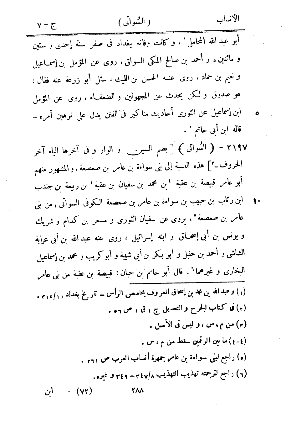 [بضم السين والواو وفي آخرها الياء آخر الحروف-[3]] هذه النسبة إلى بنى سواءة بن عامر بن صعصعة، والمشهور منهم أبو عامر قبيصة بن عقبة [4] بن محمد بن سفيان بن عقبة [4] بن ربيعة بن جندب ابن رئاب بن حبيب بن سواءة بن عامر بن صعصعة الكوفي السوائى، من بنى عامر بن صعصعة [5] ، يروى عن سفيان الثوري ومسعر بن كدام وشريك ويونس بن أبى إسحاق وابنه إسرائيل، روى عنه عبد الله بن أبى عرابة الشاشي وأحمد بن حنبل وأبو بكر بن أبى شيبة وأبو كريب ومحمد بن إسماعيل البخاري وغيرهما [6] ، قال أبو حاتم بن حبان: قبيصة بن عقبة من بنى عامر