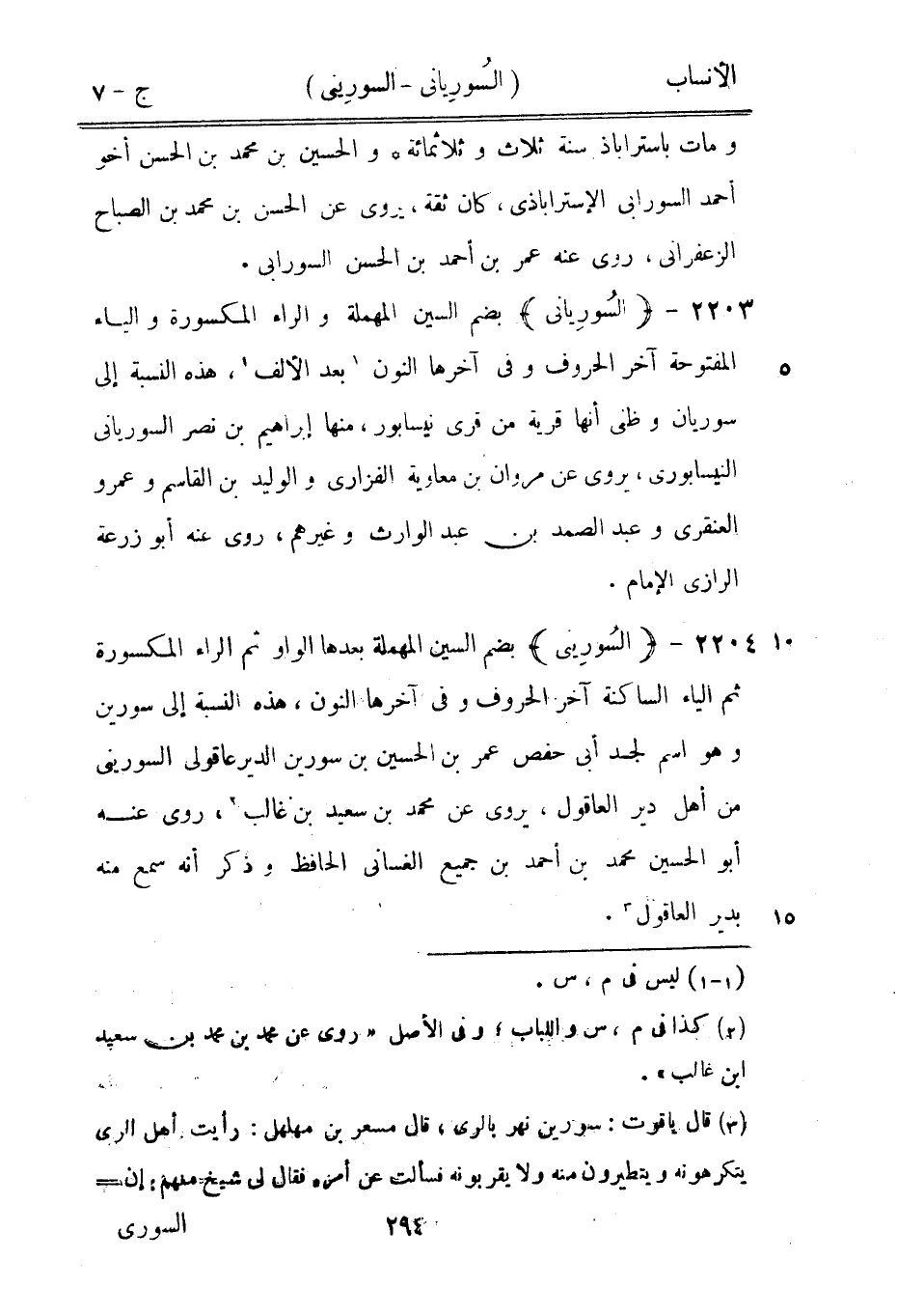 بضم السين المهملة والراء المكسورة والياء المفتوحة آخر الحروف وفي آخرها النون [1] بعد الألف [1] ، هذه النسبة إلى سوريان وظني أنها قرية من قرى نيسابور، منها إبراهيم بن نصر السوريانى النيسابورىّ، يروى عن مروان بن معاوية الفزاري والوليد بن القاسم وعمرو العنقرى وعبد الصمد بن عبد الوارث وغيرهم، روى عنه أبو زرعة الرازيّ الإمام.