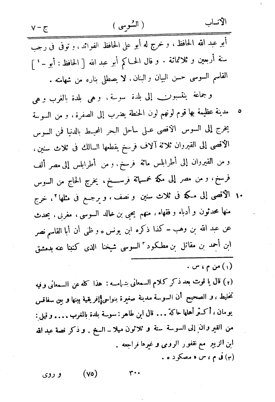 وجماعة ينتسبون إلى بلدة سوسة، وهي بلدة بالغرب وهي مدينة عظيمة بها قوم لونهم لون الحنطة يضرب إلى الصفرة، ومن السوسة يخرج إلى السوس الأقصى على ساحل البحر المحيط بالدنيا فمن السوس الأقصى إلى القيروان ثلاثة آلاف فرسخ يقطعها السالك في ثلاث سنين، ومن القيروان إلى أطرابلس مائة فرسخ، ومن أطرابلس إلى مصر ألف فرسخ، ومن مصر إلى مكة خمسمائة فرسخ، يخرج الحاج من السوس الأقصى إلى مكة في ثلاث سنين ونصف، ويرجع في مثلها [2] ، خرج منها محدثون وأدباء وفقهاء، منهم يحيى بن خالد السوسي، مغربي، يحدث عن عبد الله بن وهب- كذا ذكره ابن يونس وظني أن أبا القاسم نصر ابن أحمد بن مقاتل بن مطكود [3] السوسي شيخنا الّذي كتبنا عنه بدمشق