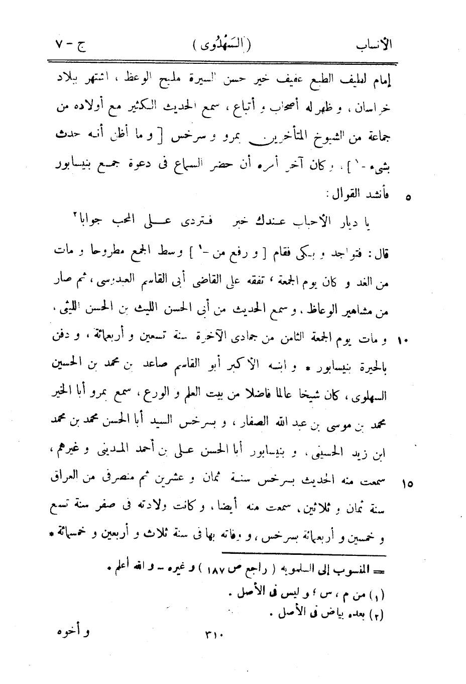 قال: فتواجد وبكى فقام [ورفع من-[1]] وسط الجمع مطروحا ومات من الغد وكان يوم الجمعة، تفقه على القاضي أبى القاسم العبدوسى، ثم صار من مشاهير الوعاظ، وسمع الحديث من أبى الحسن الليث بن الحسن الليثي، ومات يوم الجمعة الثامن من جمادى الآخرة سنة تسعين وأربعمائة، ودفن بالحيرة بنيسابور وابنه الأكبر أبو القاسم صاعد بن محمد بن الحسين السهلوى، كان شيخا عالما فاضلا من بيت العلم والورع، سمع بمرو أبا الخير محمد بن موسى بن عبد الله الصفار، وبسرخس السيد أبا الحسن محمد بن محمد ابن زيد الحسيني، وبنيسابور أبا الحسن على بن أحمد المديني وغيرهم، سمعت منه الحديث بسرخس سنة ثمان وعشرين ثم منصرفي من العراق سنة ثمان وثلاثين، سمعت منه أيضا، وكانت ولادته في صفر سنة تسع وخمسين وأربعمائة بسرخس، ووفاته بها في سنة ثلاث وأربعين وخمسمائة