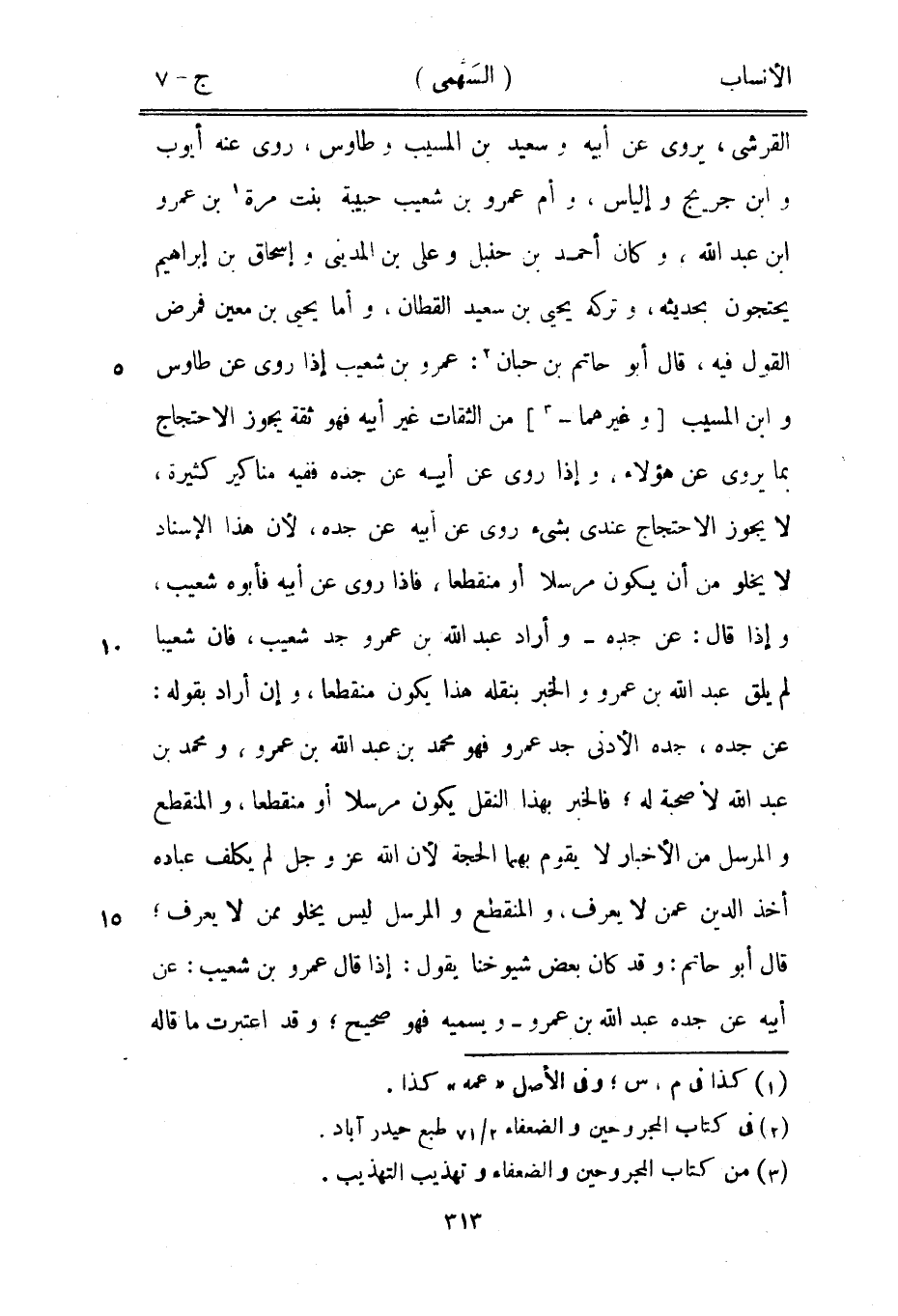 عن جده، جده الأدنى جد عمرو فهو محمد بن عبد الله بن عمرو، ومحمد بن عبد الله لا صحبة له، فالخبر بهذا النقل يكون مرسلا أو منقطعا، والمنقطع والمرسل من الأخبار لا يقوم بهما الحجة لأن الله عز وجل لم يكلف عباده أخذ الدين عمن لا يعرف، والمنقطع والمرسل ليس يخلو ممن لا يعرف، قال أبو حاتم: وقد كان بعض شيوخنا يقول: إذا قال عمرو بن شعيب: عن أبيه عن جده عبد الله بن عمرو- ويسميه فهو صحيح، وقد اعتبرت ما قاله