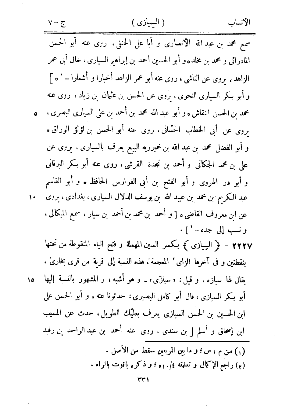 بكسر السين المهملة وفتح الياء المنقوطة من تحتها بنقطتين وفي آخرها الزاى [2] المعجمة، هذه النسبة إلى قرية من قرى بخارى، يقال لها سيازه، وقيل: «سيازى» - وهو أشبه، والمشهور بالنسبة إليها أبو بكر السيازى، قال أبو كامل البصيري: حدثونا عنه وأبو الحسن على ابن الحسين بن الحسن السيازى يعرف بعليّك الطويل، حدث عن المسيب ابن إسحاق وأسلم [بن سندي، روى عنه أحمد بن عبد الواحد بن رفيد