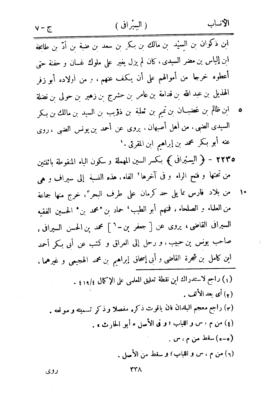 بكسر السين المهملة وسكون الياء المنقوطة باثنتين من تحتها وفتح الراء وفي آخرها [2] الفاء، هذه النسبة إلى سيراف وهي من بلاد فارس مما يلي حد كرمان على طرف البحر [3] ، خرج منها جماعة من العلماء والصلحاء، فمنهم أبو الطيب [4] حماد بن [5] محمد بن [5] الحسين الفقيه السيرافي القاضي، يروى عن [جعفر بن-[6]] محمد بن الحسن السيرافي، صاحب يونس بن حبيب، ورحل إلى العراق وكتب عن أبى بكر أحمد ابن كامل بن شجرة القاضي وأبى إسحاق إبراهيم بن محمد الهجيمي وغيرهما،
