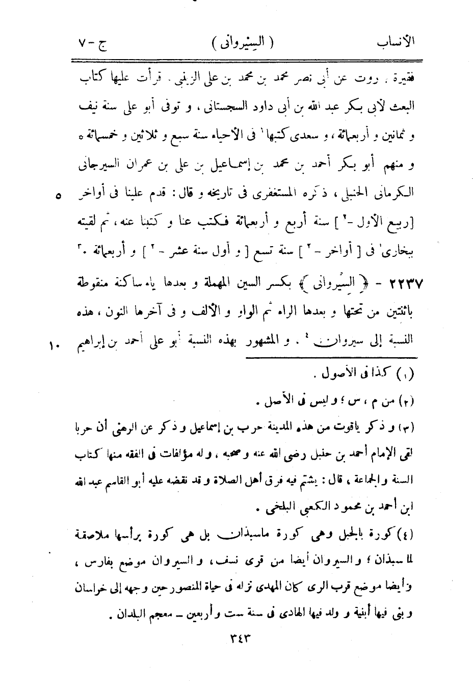 فقيرة، روت عن أبى نصر محمد بن محمد بن على الزينبي، قرأت عليها كتاب البعث لأبى بكر عبد الله بن أبى داود السجستاني، وتوفى أبو على سنة نيف وثمانين وأربعمائة، وسعدى كتبها [1] في الأحياء سنة سبع وثلاثين وخمسمائة ومنهم أبو بكر أحمد بن محمد بن إسماعيل بن على بن عمران السيرجانى الكرماني الحنبلي، ذكره المستغفري في تاريخه وقال: قدم علينا في أواخر [ربيع الأول-[2]] سنة أربع وأربعمائة فكتب عنا وكتبنا عنه، ثم لقيته ببخارى في [أواخر-[2]] سنة تسع [وأول سنة عشر-[2]] وأربعمائة. [3]