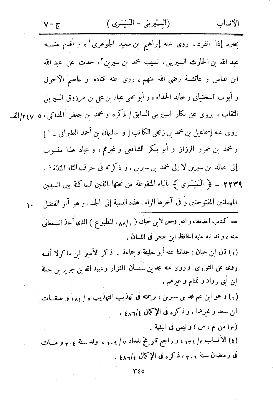 [4] الأنساب 3/ 139، وراجع تاريخ بغداد 7/ 109، ولد سنة 204 ومات في رمضان سنة 309، ذكره في الإكمال 4/ 486.
