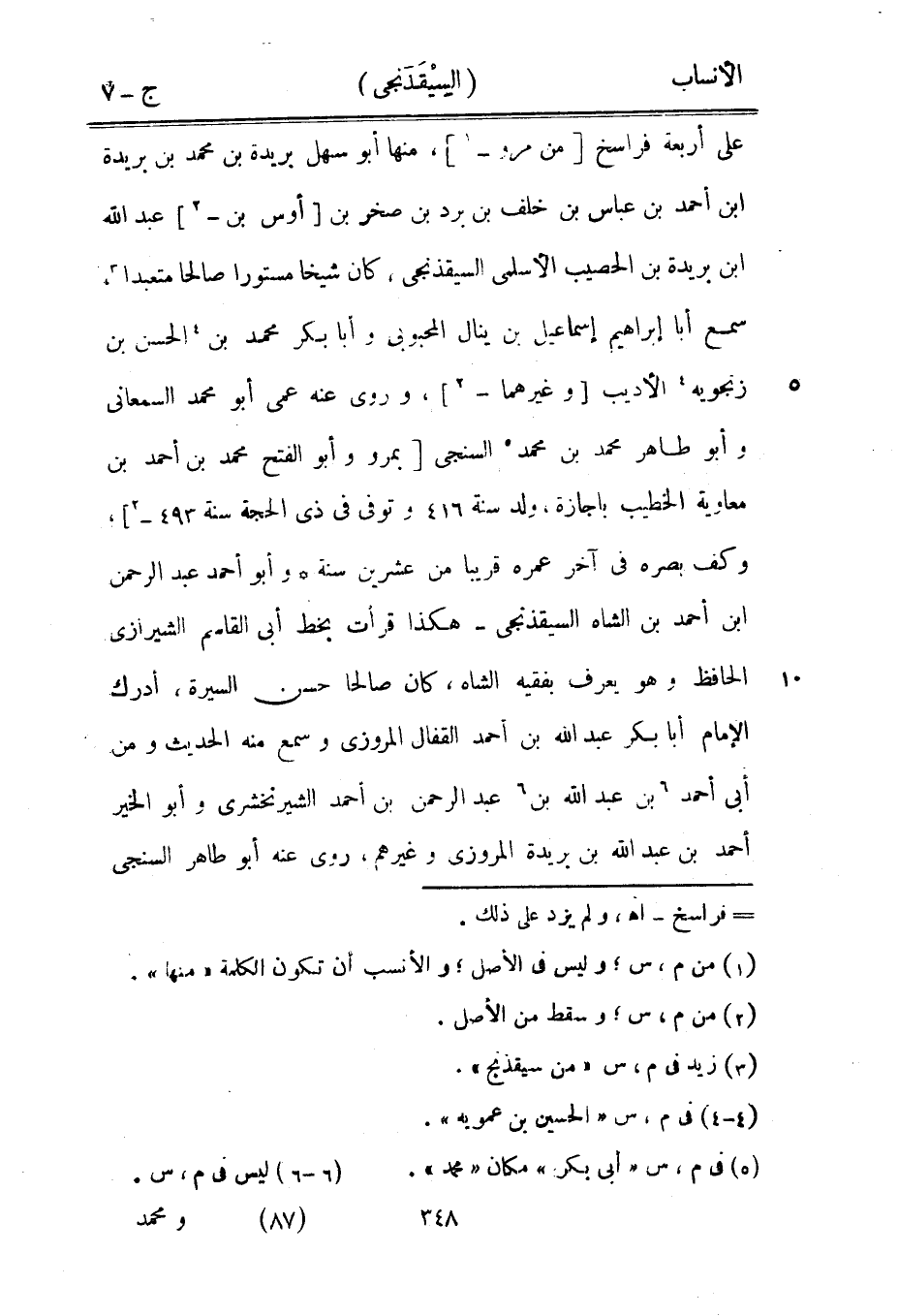 على أربعة فراسخ [من مرو-[1]] ، منها أبو سهل بريدة بن محمد بن بريدة ابن أحمد بن عباس بن خلف بن برد بن صخر بن [أوس بن-[2]] عبد الله ابن بريدة بن الحصيب الأسلمي السيقذنجى، كان شيخا مستورا صالحا متعبدا [3] ، سمع أبا إبراهيم إسماعيل بن ينال المحبوبي وأبا بكر محمد بن [4] الحسن بن زنجويه [4] الأديب [وغيرهما-[2]] ، وروى عنه عمى أبو محمد السمعاني وأبو طاهر محمد بن محمد [5] السنجى [بمرو وأبو الفتح محمد بن أحمد بن معاوية الخطيب بإجازة، ولد سنة 416 وتوفى في ذي الحجة سنة 493-[2]] ، وكف بصره في آخر عمره قريبا من عشرين سنة وأبو أحمد عبد الرحمن ابن أحمد بن الشاه السيقذنجى- هكذا قرأت بخط أبى القاسم الشيرازي الحافظ وهو يعرف بفقيه الشاه، كان صالحا حسن السيرة، أدرك الإمام أبا بكر عبد الله بن أحمد القفال المروزي وسمع منه الحديث ومن أبى أحمد [6] بن عبد الله بن [6] عبد الرحمن بن أحمد الشيرنخشرى وأبو الخير أحمد بن عبد الله بن بريدة المروزي وغيرهم، روى عنه أبو طاهر السنجى