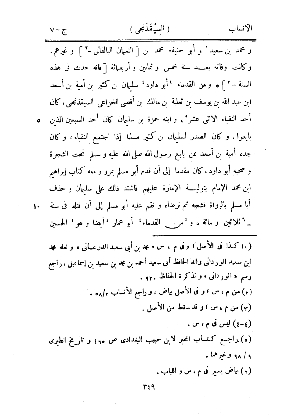 ومحمد بن سعيد [1] وأبو حنيفة محمد بن [النعمان البالقانى-[2]] وغيرهم، وكانت وفاته بعد سنة خمس وثمانين وأربعمائة [فإنه حدث في هذه السنة-[3]] ومن القدماء [4] أبو داود [4] سليمان بن كثير بن أمية بن أسعد ابن عبد الله بن يوسف بن ثعلبة بن مالك بن أقصى الخزاعي السيقذنجى، كان أحد النقباء الاثني عشر [5] ، وابنه حمزة بن سليمان كان أحد السبعين الذين بايعوا، وكان الصدر لسليمان بن كثير مسلما إذا اجتمع النقباء، وكان جده أمية بن أسعد ممن بايع رسول الله صلى الله عليه وسلم تحت الشجرة وصحبه أبو داود، كان مقدما إلى أن قدم أبو مسلم بمرو ومعه كتاب إبراهيم ابن محمد الإمام بتولية الإمارة عليهم فاشتد ذلك على سليمان وحذف أبا مسلم بالرواة فشجه ثم ترضاه ونقم عليه أبو مسلم إلى أن قتله في سنة-[6] ثلاثين ومائة و [4] من القدماء [4] أبو عمار [4] أيضا وهو [4] الحسين