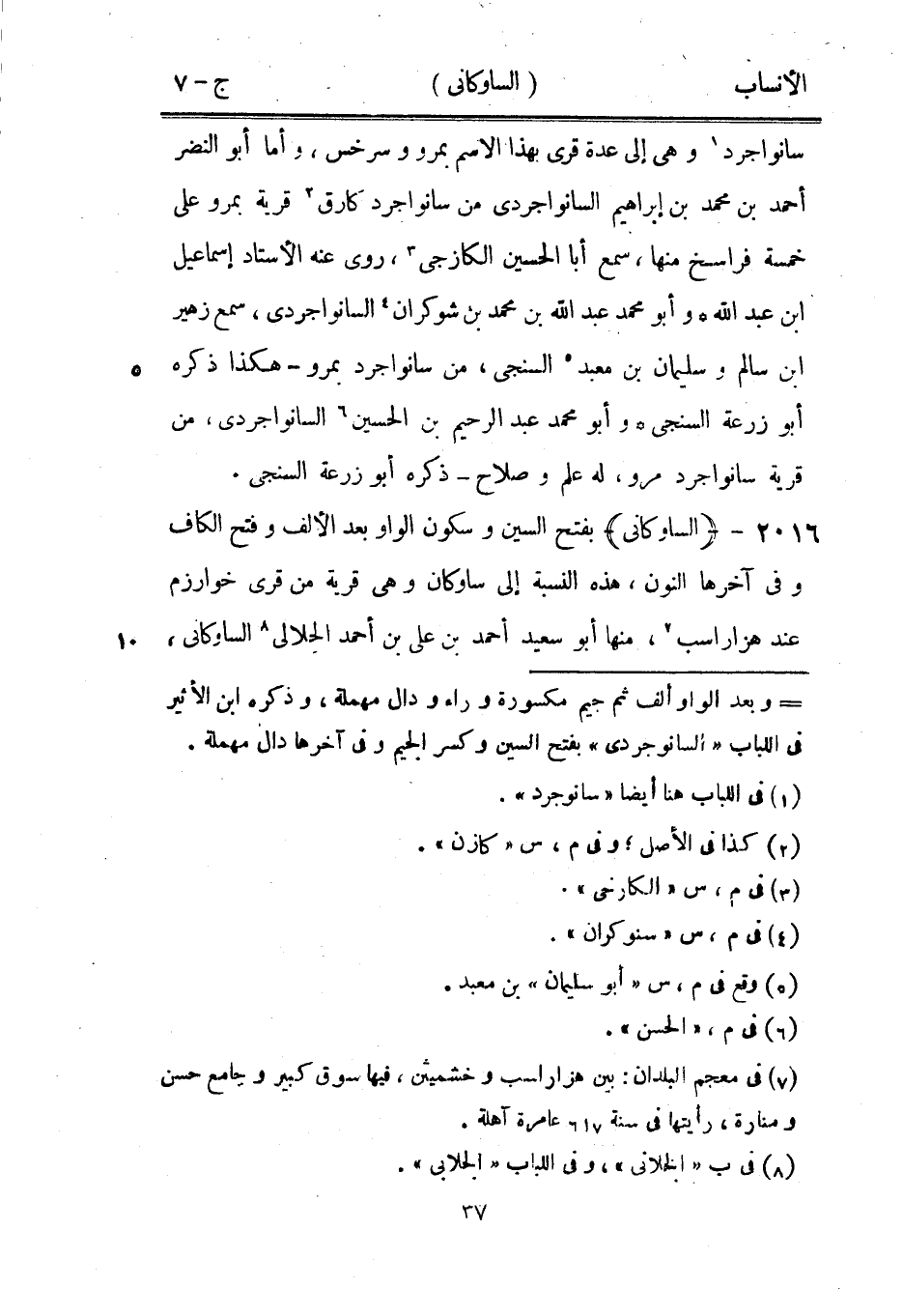 [ () ] وبعد الواو ألف ثم جيم مكسورة وراء ودال مهملة، وذكره ابن الأثير في اللباب «السانواجردي» بفتح السين وكسر الجيم وفي آخرها دال مهملة.
