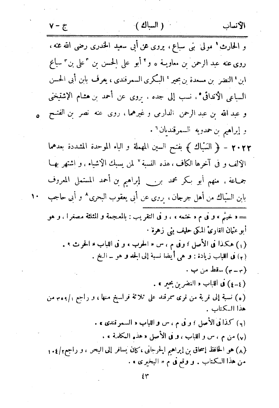 بفتح السين المهملة والباء الموحدة المشددة بعدهما الألف وفي آخرها الكاف، هذه النسبة [7] لمن يسبك الأشياء. واشتهر بها جماعة، منهم أبو بكر محمد بن إبراهيم بن أحمد المستملي المعروف بابن السبّاك من أهل جرجان، يروى عن أبى يعقوب البحري [8] وأبى حاجب