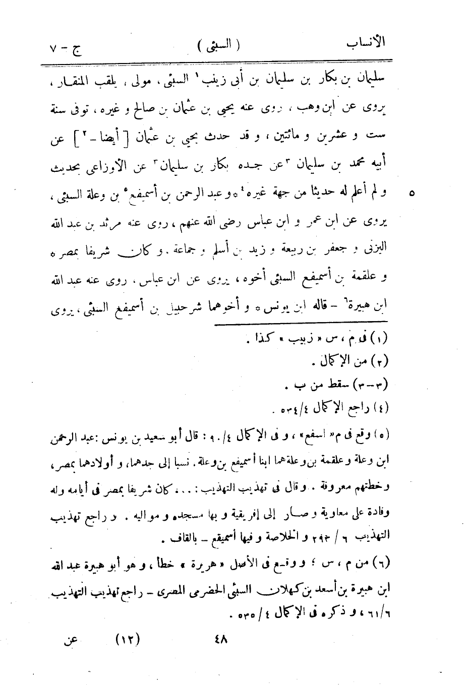 سليمان بن بكار بن سليمان بن أبى زينب [1] السبئي، مولى، يلقب المنقار، يروى عن ابن وهب، روى عنه يحيى بن عثمان بن صالح وغيره، توفى سنة ست وعشرين ومائتين، وقد حدث يحيى بن عثمان [أيضا-[2]] عن أبيه محمد بن سليمان [3] عن جده بكار بن سليمان [3] عن الأوزاعي بحديث ولم أعلم له حديثا من جهة غيره [4] وعبد الرحمن بن أسميفع [5] بن وعلة السبئي، يروى عن ابن عمر وابن عباس رضى الله عنهم، روى عنه مرثد بن عبد الله اليزني وجعفر بن ربيعة وزيد بن أسلم وجماعة، وكان شريفا بمصر وعلقمة بن أسميفع السبئي أخوه، يروى عن ابن عباس، روى عنه عبد الله ابن هبيرة [6]- قاله ابن يونس وأخوهما شرحبيل بن أسميفع السبئي، يروى