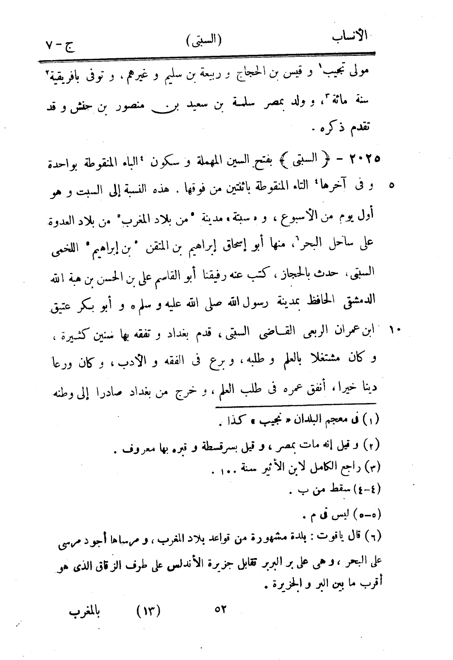 بفتح السين المهملة وسكون [4] الباء المنقوطة بواحدة وفي آخرها [4] التاء المنقوطة باثنتين من فوقها، هذه النسبة إلى السبت وهو أول يوم من الأسبوع، و «سبتة» مدينة [5] من بلاد المغرب [5] من بلاد العدوة على ساحل البحر [6] ، منها أبو إسحاق إبراهيم بن المتقن [5] بن إبراهيم [5] اللخمي السبتي، حدث بالحجاز، كتب عنه رفيقنا أبو القاسم على بن الحسن بن هبة الله الدمشقيّ الحافظ بمدينة رسول الله صلى الله عليه وسلم وأبو بكر عتيق ابن عمران الربعي القاضي السبتي، قدم بغداد وتفقه بها سنين كثيرة، وكان مشتغلا بالعلم وطلبه، وبرع في الفقه والأدب، وكان ورعا دينا خيرا، أنفق عمره في طلب العلم، وخرج من بغداد صادرا إلى وطنه