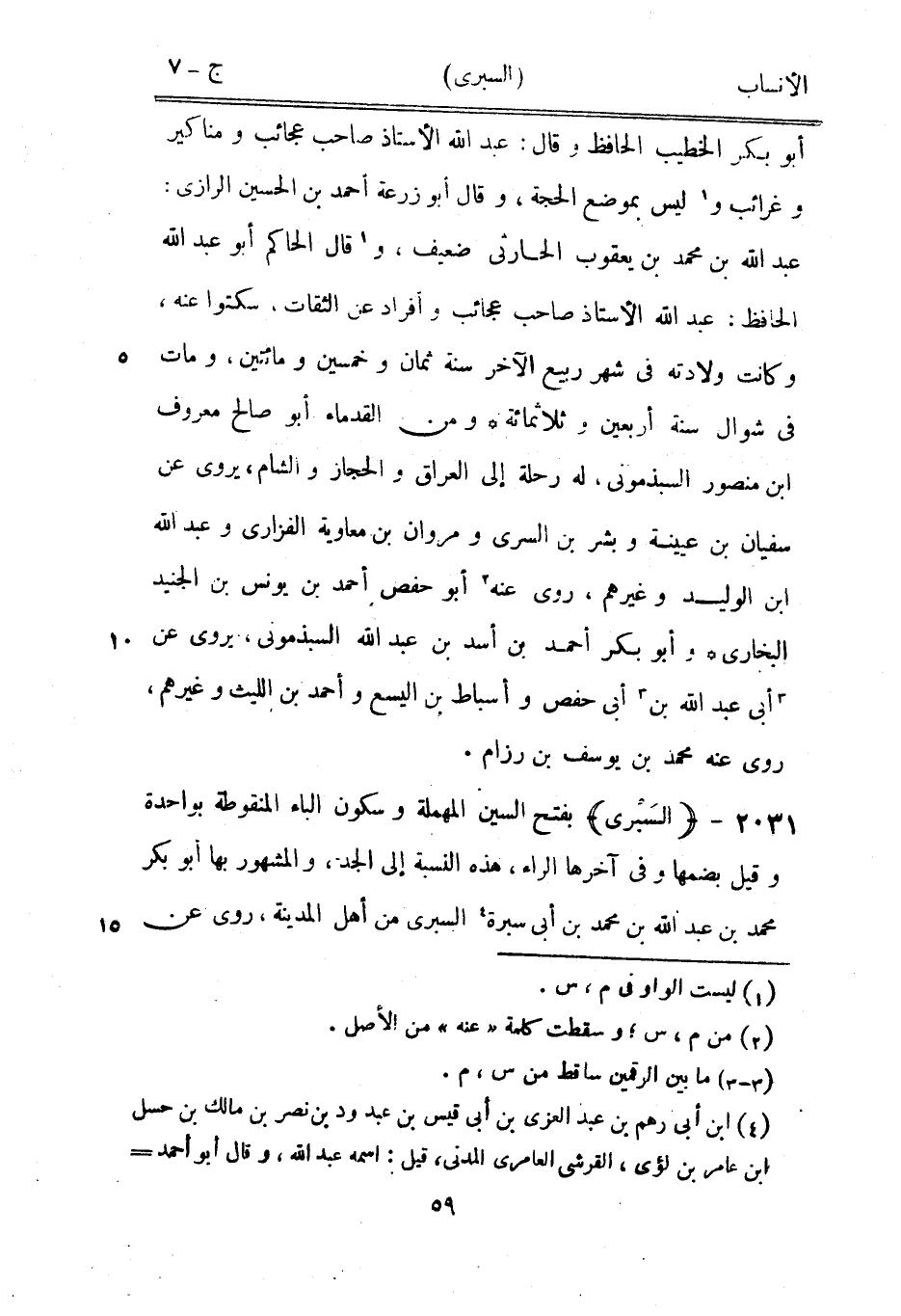 بفتح السين المهملة وسكون الباء المنقوطة بواحدة وقيل بضمها وفي آخرها الراء، هذه النسبة إلى الجد، والمشهور بها أبو بكر محمد بن عبد الله بن محمد بن أبى سبرة [4] السبرى من أهل المدينة، روى عن