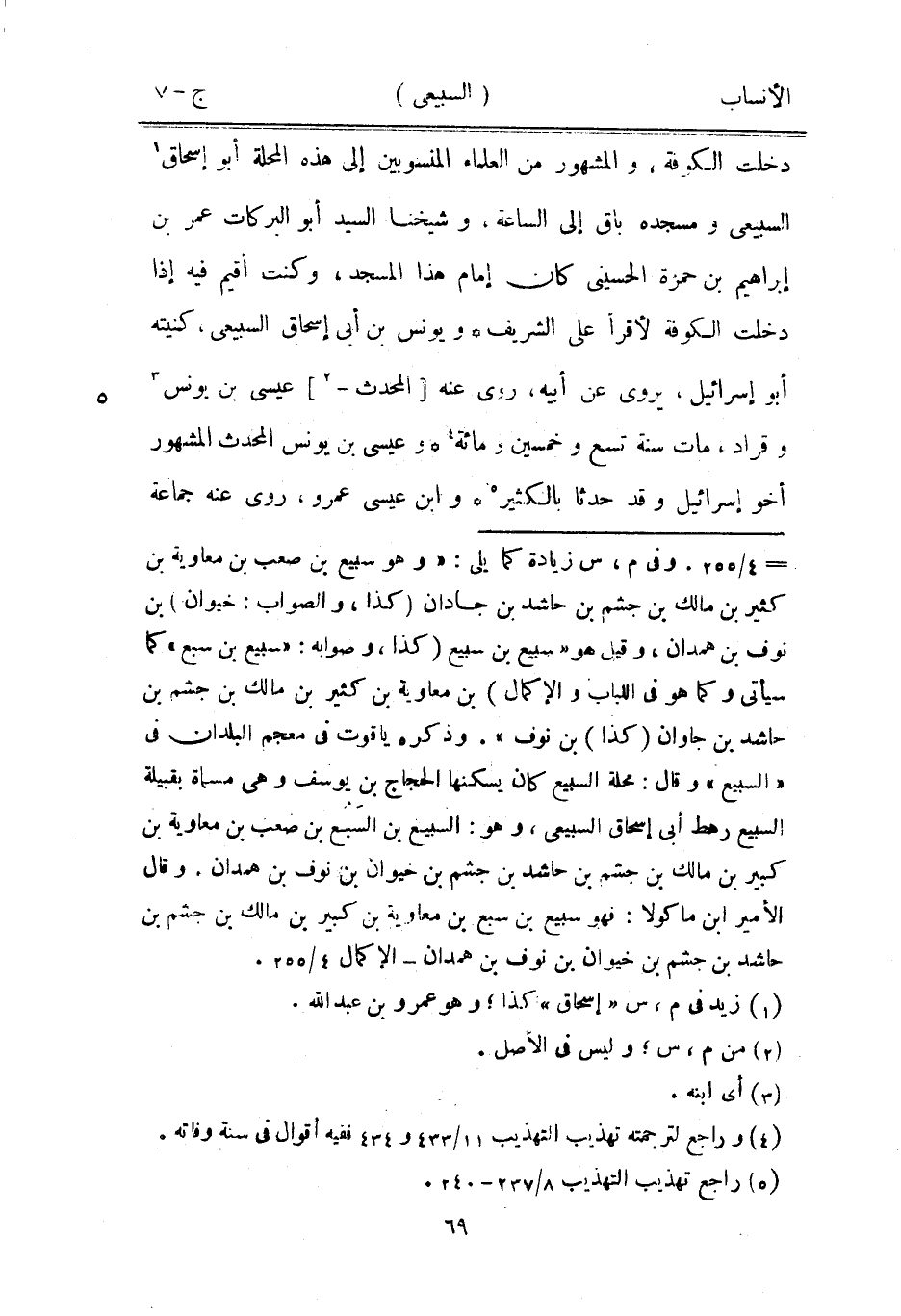 [ () ] 4/ 255. وفي م، س زيادة كما يلي: «وهو سبيع بن صعب بن معاوية بن كثير بن مالك بن جشم بن حاشد بن جادان (كذا، والصواب: خيوان) بن نوف بن همدان، وقيل هو «سبيع بن سبيع (كذا، وصوابه: «سبيع بن سبع» كما سيأتي وكما هو في اللباب والإكمال) بن معاوية بن كثير بن مالك بن جشم بن حاشد بن جاوان (كذا) بن نوف» . وذكره ياقوت في معجم البلدان في «السبيع» وقال: محلة السبيع كان يسكنها الحجاج بن يوسف وهي مسماة بقبيلة السبيع رهط أبى إسحاق السبيعي، وهو: السبيع بن السبع بن صعب بن معاوية بن كبير بن مالك بن جشم بن حاشد بن جشم بن خيوان بن نوف بن همدان. وقال الأمير ابن ماكولا: فهو سبيع بن سبع بن معاوية بن كبير بن مالك بن جشم بن حاشد بن جشم بن خيوان بن نوف بن همدان- الإكمال 4/ 255.