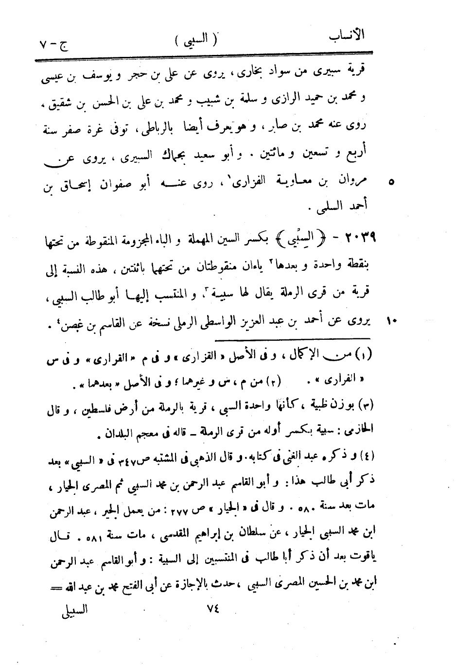 بكسر السين المهملة والباء المجزومة المنقوطة من تحتها بنقطة واحدة وبعدها [2] ياءان منقوطتان من تحتهما باثنتين، هذه النسبة إلى قرية من قرى الرملة يقال لها سبية [3] ، والمنتسب إليها أبو طالب السبيى، يروى عن أحمد بن عبد العزيز الواسطي الرمليّ نسخة عن القاسم بن غصن [4] .