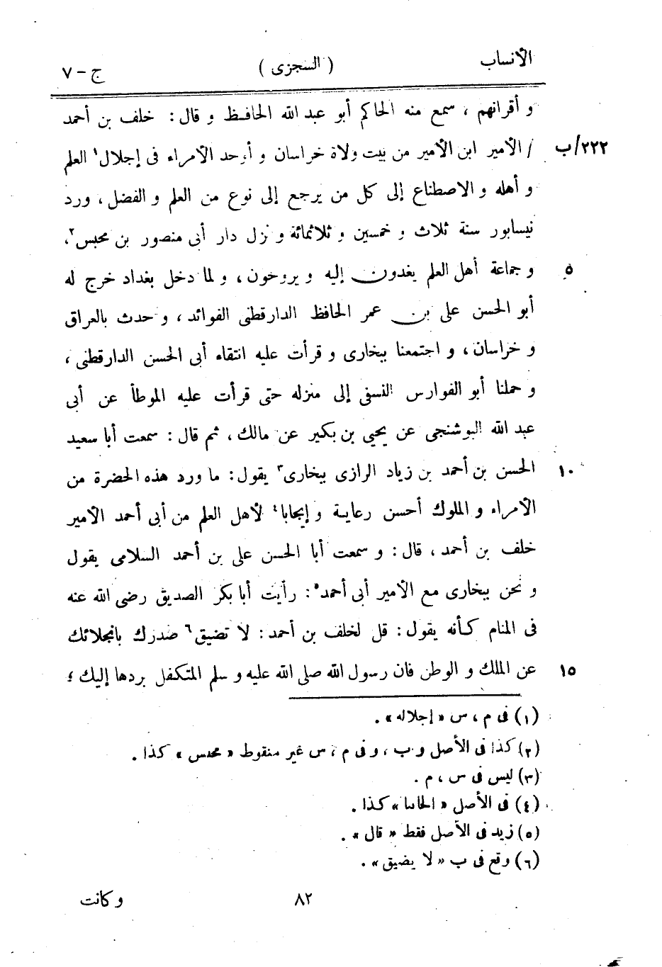 وأقرانهم، سمع منه الحاكم أبو عبد الله الحافظ وقال: خلف بن أحمد الأمير ابن الأمير من بيت ولاة خراسان وأوحد الأمراء في إجلال [1] العلم وأهله والاصطناع إلى كل من يرجع إلى نوع من العلم والفضل، ورد نيسابور سنة ثلاث وخمسين وثلاثمائة ونزل دار أبى منصور بن محبس [2] ، وجماعة أهل العلم يغدون إليه ويروحون، ولما دخل بغداد خرج له أبو الحسن على بن عمر الحافظ الدار قطنى الفوائد، وحدث بالعراق وخراسان، واجتمعنا ببخارى وقرأت عليه انتقاء أبى الحسن الدار قطنى، وحملنا أبو الفوارس النسفي إلى منزله حتى قرأت عليه الموطأ عن أبى عبد الله البوشنجي عن يحيى بن بكير عن مالك، ثم قال: سمعت أبا سعيد الحسن بن أحمد بن زياد الرازيّ ببخارى [3] يقول: ما ورد هذه الحضرة من الأمراء والملوك أحسن رعاية وإيجابا [4] لأهل العلم من أبى أحمد الأمير خلف بن أحمد، قال: وسمعت أبا الحسن على بن أحمد السلامي يقول ونحن ببخارى مع الأمير أبى أحمد [5] . رأيت أبا بكر الصديق رضى الله عنه في المنام كأنه يقول: قل لخلف بن أحمد: لا تضيق [6] صدرك بانجلائك عن الملك والوطن فان رسول الله صلّى الله عليه وسلم المتكفل بردها إليك،