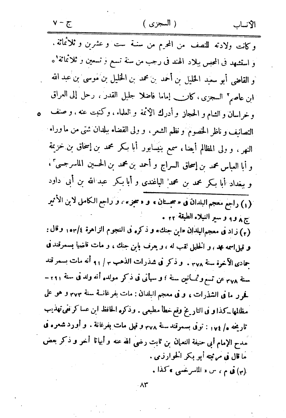 [1] راجع معجم البلدان في «سجستان» و «سجز» وراجع الكامل لابن الأثير ج 8 و 9 وسير النبلاء الطبقة 22.