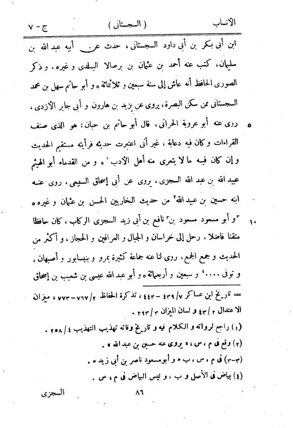 ابن أبى بكر بن أبى داود السجستاني، حدث عن أبيه عبد الله بن سليمان، كتب عنه أحمد بن عثمان بن برصالا البلدي وغيره، وذكر الصوري الحافظ أنه عاش إلى سنة سبعين وثلاثمائة وأبو حاتم سهل بن محمد السجستاني ممن سكن البصرة، يروى عن يزيد بن هارون وأبى جابر الأزدي، روى عنه أبو عروبة الحراني، قال أبو حاتم بن حبان: هو الّذي صنف القراءات وكان فيه دعابة، غير أنى اعتبرت حديثه فرأيته مستقيم الحديث وإن كان فيه ما لا يتعرى منه أهل الأدب [1] ومن القدماء أبو الهيثم عبيد الله بن عبد الله السجزى، يروى عن أبى إسحاق السبيعي، روى عنه ابنه حسين بن عبيد الله [2] من حديث البخاريين الحسن بن عثمان وغيره [3] وأبو مسعود مسعود بن [3] نافع بن أبى زيد السجزى الركاب، كان حافظا متقنا فاضلا، رحل إلى خراسان والجبال والعراقين والحجاز، وأكثر من الحديث وجمع الجمع، روى لنا عنه جماعة كثيرة بمرو وبنيسابور وأصبهان، وتوفى.... [4] وسبعين وأربعمائة وأبو عبد الله عيسى بن شعيب بن إسحاق
