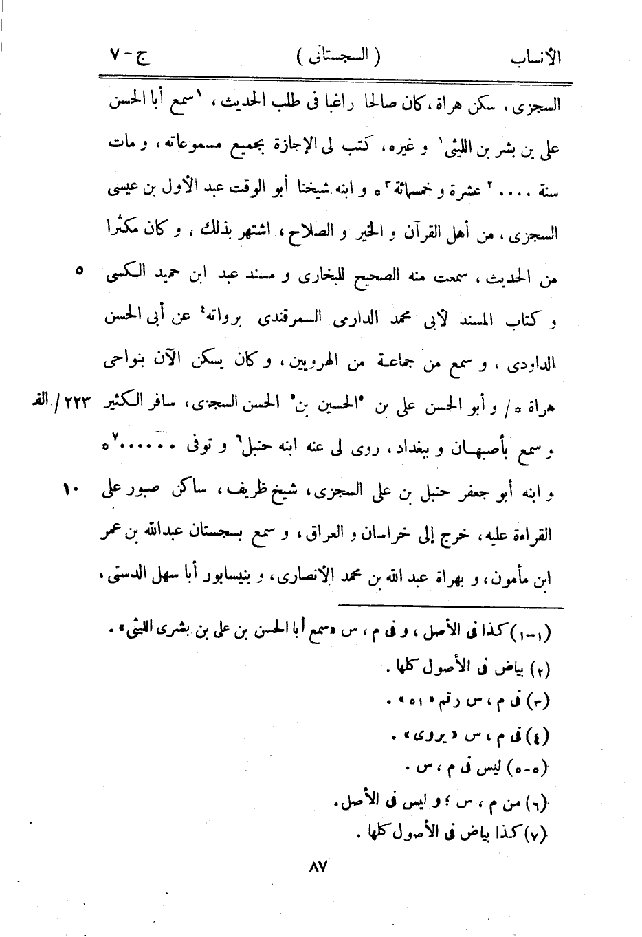 السجزى، سكن هراة، كان صالحا راغبا في طلب الحديث، [1] سمع أبا الحسن على بن بشر بن الليثي [1] وغيره، كتب لي الإجازة بجميع مسموعاته، ومات سنة.... [2] عشرة وخمسمائة [3] وابنه شيخنا أبو الوقت عبد الأول بن عيسى السجزى، من أهل القرآن والخير والصلاح، اشتهر بذلك، وكان مكثرا من الحديث، سمعت منه الصحيح للبخاريّ ومسند عبد ابن حميد الكسى وكتاب المسند لأبى محمد الدارميّ السمرقندي برواته [4] عن أبى الحسن الداوديّ، وسمع من جماعة من الهرويين، وكان يسكن الآن بنواحي هراة/ وأبو الحسن على بن [5] الحسين بن [5] الحسن السجزى، سافر الكثير وسمع بأصبهان وببغداد، روى لي عنه ابنه حنبل [6] وتوفى...... [7] وابنه أبو جعفر حنبل بن على السجزى، شيخ ظريف، ساكن صبور على القراءة عليه، خرج إلى خراسان والعراق، وسمع بسجستان عبد الله بن عمر ابن مأمون، وبهراة عبد الله بن محمد الأنصاري، وبنيسابور أبا سهل الدستى،