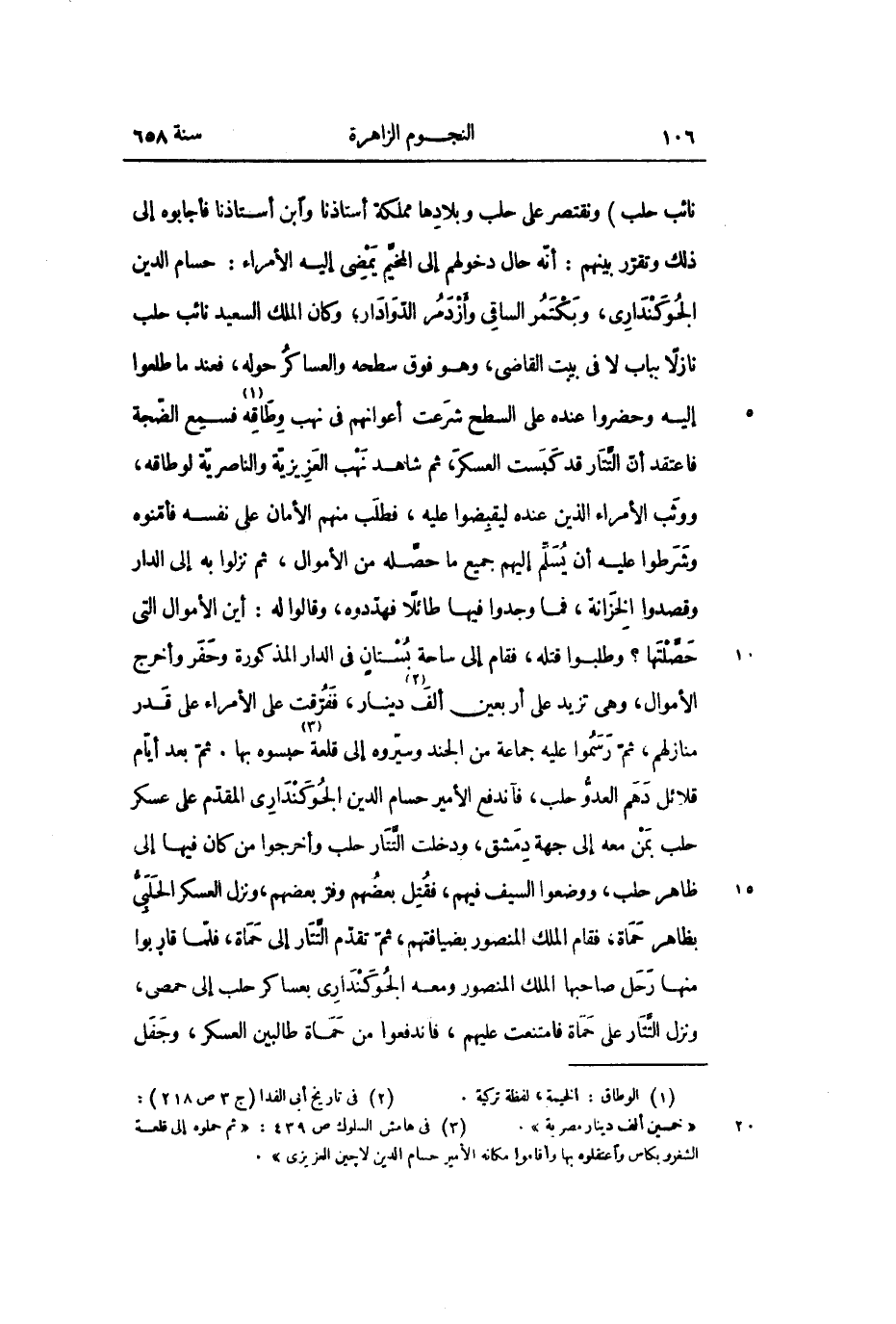 نائب حلب) ونقتصر على حلب وبلادها مملكة أستاذنا وابن أستاذنا فأجابوه إلى ذلك وتقرّر بينهم: أنّه حال دخولهم إلى المخيّم يمضى إليه الأمراء: حسام الدين الجوكندارى، وبكتمر الساقى وأزدمر الدّوادار؛ وكان الملك السعيد نائب حلب نازلا بباب لا فى بيت القاضى، وهو فوق سطحه والعساكر حوله، فعند ما طلعوا إليه وحضروا عنده على السطح شرعت أعوانهم فى نهب وطاقه «1» فسمع الضّجة فاعتقد أنّ التّتار قد كبست العسكر، ثم شاهد نهب العزيزيّة والناصريّة لوطاقه، ووثب الأمراء الذين عنده ليقبضوا عليه، فطلب منهم الأمان على نفسه فأمّنوه وشرطوا عليه أن يسلّم إليهم جميع ما حصّله من الأموال، ثم نزلوا به إلى الدار وقصدوا الخزانة، فما وجدوا فيها طائلا فهدّدوه، وقالوا له: أين الأموال التى حصّلتها؟ وطلبوا قتله، فقام إلى ساحة بستان فى الدار المذكورة وحفر وأخرج الأموال، وهى تزيد على أربعين ألف «2» دينار، ففرّقت على الأمراء على قدر منازلهم، ثمّ رسموا عليه جماعة من الجند وسيّروه إلى قلعة «3» حبسوه بها. ثمّ بعد أيّام قلائل دهم العدوّ حلب، فاندفع الأمير حسام الدين الجوكندارى المقدّم على عسكر حلب بمن معه إلى جهة دمشق، ودخلت التّتار حلب وأخرجوا من كان فيها إلى ظاهر حلب، ووضعوا السيف فيهم، فقتل بعضهم وفرّ بعضهم، ونزل العسكر الحلبىّ بظاهر حماة، فقام الملك المنصور بضيافتهم، ثمّ تقدّم التّتار إلى حماة، فلمّا قاربوا منها رحل صاحبها الملك المنصور ومعه الجوكندارى بعساكر حلب إلى حمص، ونزل التّتار على حماة فامتنعت عليهم، فاندفعوا من حماة طالبين العسكر، وجفل