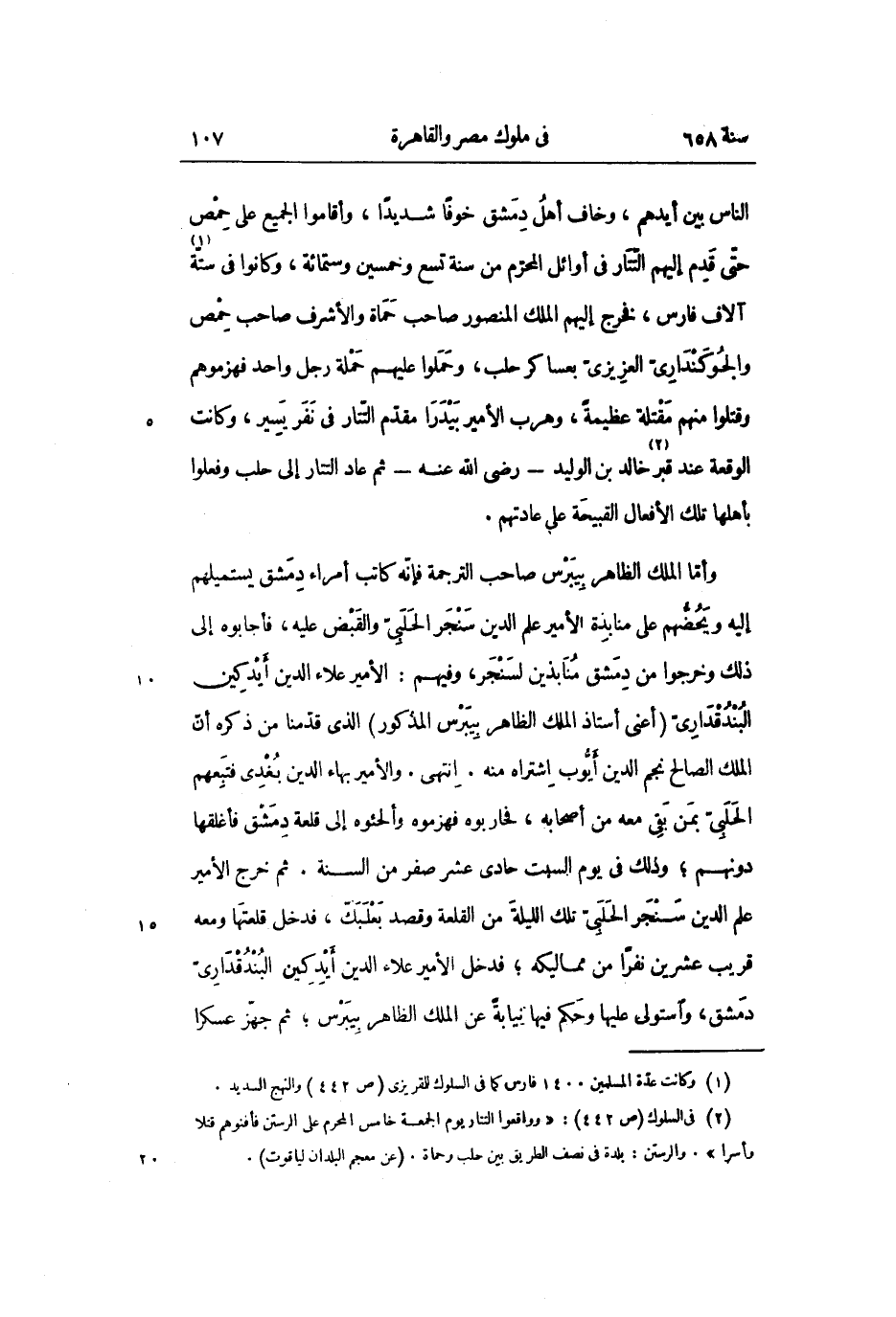 وأمّا الملك الظاهر بيبرس صاحب الترجمة فإنّه كاتب أمراء دمشق يستميلهم إليه ويحضّهم على منابذة الأمير علم الدين سنجر الحلبىّ والقبض عليه، فأجابوه إلى ذلك وخرجوا من دمشق منابذين لسنجر، وفيهم: الأمير علاء الدين أيدكين البندقدارىّ (أعنى أستاذ الملك الظاهر بيبرس المذكور) الذي قدّمنا من ذكره أنّ الملك الصالح نجم الدين أيّوب اشتراه منه. انتهى. والأمير بهاء الدين بغدى فتبعهم الحلبىّ بمن بقى معه من أصحابه، فحاربوه فهزموه وألجئوه إلى قلعة دمشق فأغلقها دونهم؛ وذلك فى يوم السبت حادى عشر صفر من السنة. ثم خرج الأمير علم الدين سنجر الحلبىّ تلك الليلة من القلعة وقصد بعلبك، فدخل قلعتها ومعه قريب عشرين نفرا من مماليكه؛ فدخل الأمير علاء الدين أيدكين البندقدارىّ دمشق، واستولى عليها وحكم فيها نيابة عن الملك الظاهر بيبرس؛ ثم جهّز عسكرا