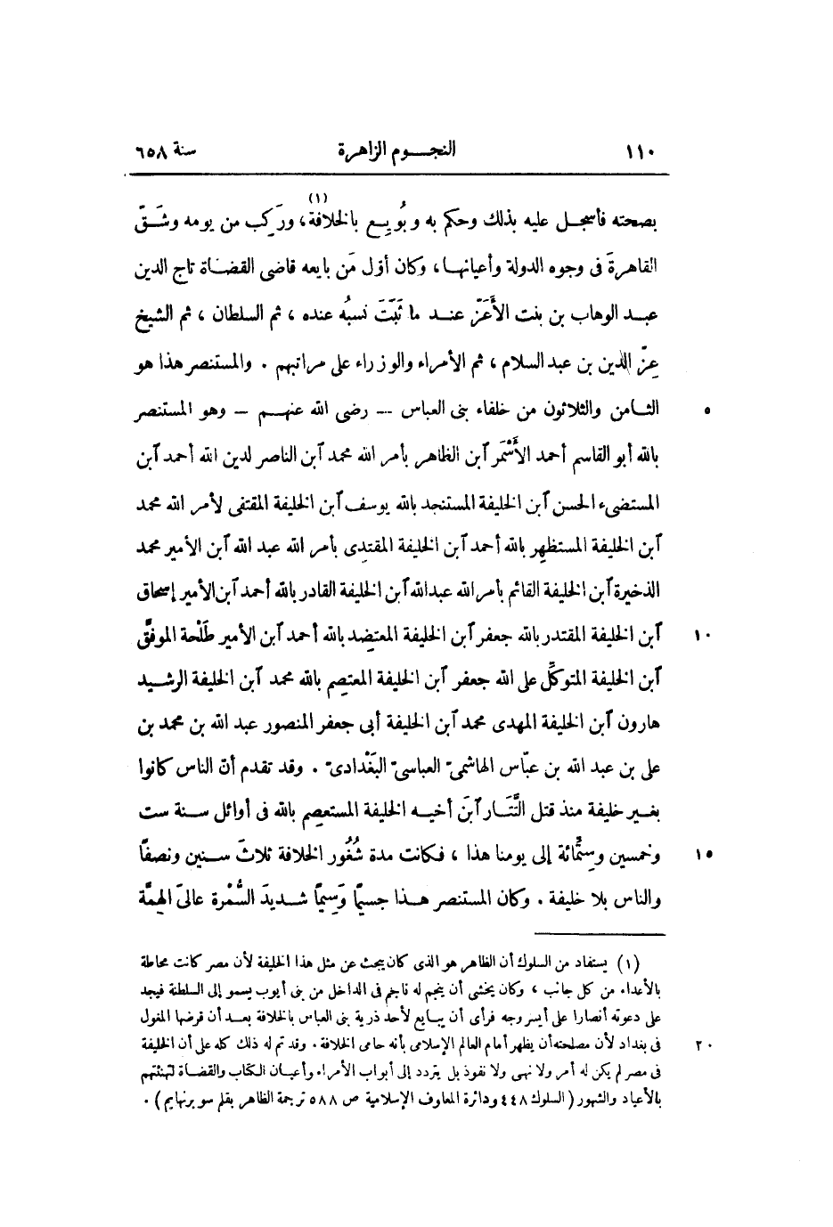 بصحته فأسجل عليه بذلك وحكم به وبويع بالخلافة «1» ، وركب من يومه وشقّ القاهرة فى وجوه الدولة وأعيانها، وكان أوّل من بايعه قاضى القضاة تاج الدين عبد الوهاب بن بنت الأعزّ عند ما ثبت نسبه عنده، ثم السلطان، ثم الشيخ عزّ الدين بن عبد السلام، ثم الأمراء والوزراء على مراتبهم. والمستنصر هذا هو الثامن والثلاثون من خلفاء بنى العباس- رضى الله عنهم- وهو المستنصر بالله أبو القاسم أحمد الأسمر ابن الظاهر بأمر الله محمد ابن الناصر لدين الله أحمد ابن المستضىء الحسن ابن الخليفة المستنجد بالله يوسف ابن الخليفة المقتفى لأمر الله محمد ابن الخليفة المستظهر بالله أحمد ابن الخليفة المقتدى بأمر الله عبد الله ابن الأمير محمد الذخيرة ابن الخليفة القائم بأمر الله عبد الله ابن الخليفة القادر بالله أحمد ابن الأمير إسحاق ابن الخليفة المقتدر بالله جعفر ابن الخليفة المعتضد بالله أحمد ابن الأمير طلحة الموفّق ابن الخليفة المتوكّل على الله جعفر ابن الخليفة المعتصم بالله محمد ابن الخليفة الرشيد هارون ابن الخليفة المهدى محمد ابن الخليفة أبى جعفر المنصور عبد الله بن محمد بن على بن عبد الله بن عبّاس الهاشمىّ العباسىّ البغدادىّ. وقد تقدم أنّ الناس كانوا بغير خليفة منذ قتل التّتار ابن أخيه الخليفة المستعصم بالله فى أوائل سنة ست وخمسين وستّمائة إلى يومنا هذا، فكانت مدة شغور الخلافة ثلاث سنين ونصفا والناس بلا خليفة. وكان المستنصر هذا جسيما وسيما شديد السّمرة عالى الهمّة