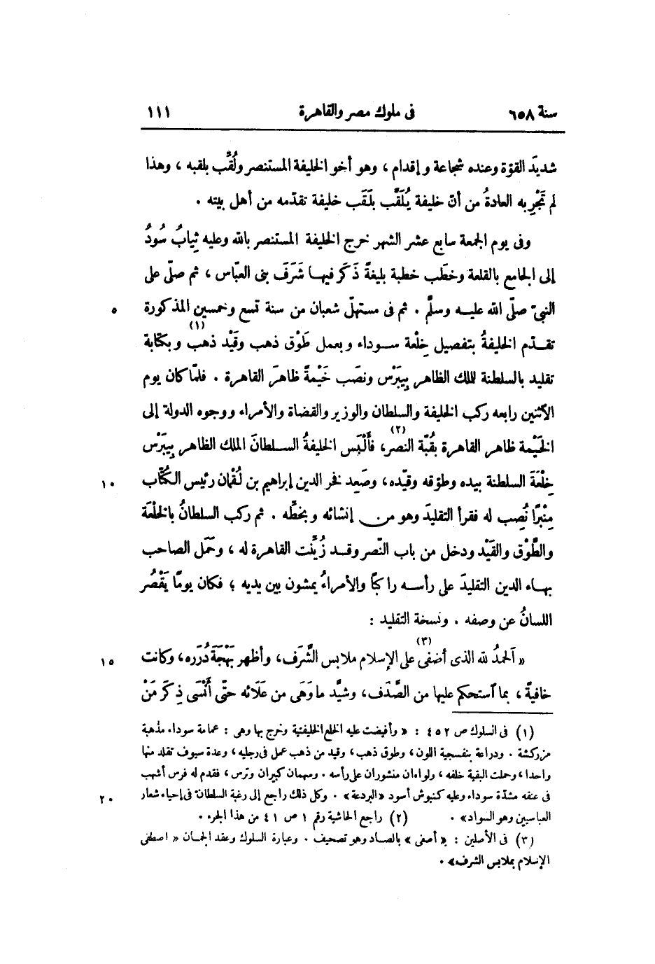 وفى يوم الجمعة سابع عشر الشهر خرج الخليفة المستنصر بالله وعليه ثياب سود إلى الجامع بالقلعة وخطب خطبة بليغة ذكر فيها شرف بنى العبّاس، ثم صلّى على النّبيّ صلّى الله عليه وسلّم. ثم فى مستهلّ شعبان من سنة تسع وخمسين المذكورة تقدّم الخليفة بتفصيل خلعة سوداء وبعمل طوق ذهب وقيد ذهب «1» وبكتابة تقليد بالسلطنة للملك الظاهر بيبرس ونصب خيمة ظاهر القاهرة. فلمّا كان يوم الاثنين رابعه ركب الخليفة والسلطان والوزير والقضاة والأمراء ووجوه الدولة إلى الخيمة ظاهر القاهرة بقبّة النصر «2» ، فألبس الخليفة السلطان الملك الظاهر بيبرس خلعة السلطنة بيده وطوّقه وقيّده، وصعد فخر الدين إبراهيم بن لقمان رئيس الكتّاب منبرا نصب له فقرأ التقليد وهو من إنشائه وبخطّه. ثم ركب السلطان بالخلعة والطّوق والقيد ودخل من باب النّصر وقد زيّنت القاهرة له، وحمل الصاحب بهاء الدين التقليد على رأسه راكبا والأمراء يمشون بين يديه؛ فكان يوما يقصر اللسان عن وصفه. ونسخة التقليد:
